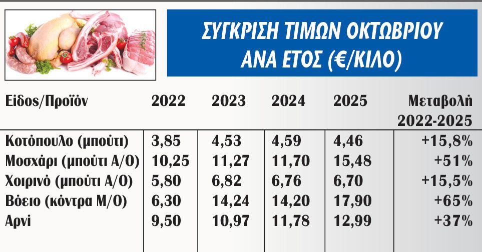 Το αρνί, που το 2022 πωλούταν 9,50 ευρώ/κιλό, έφτασε στα 12,99 ευρώ/κιλό τον Οκτώβριο του 2025.