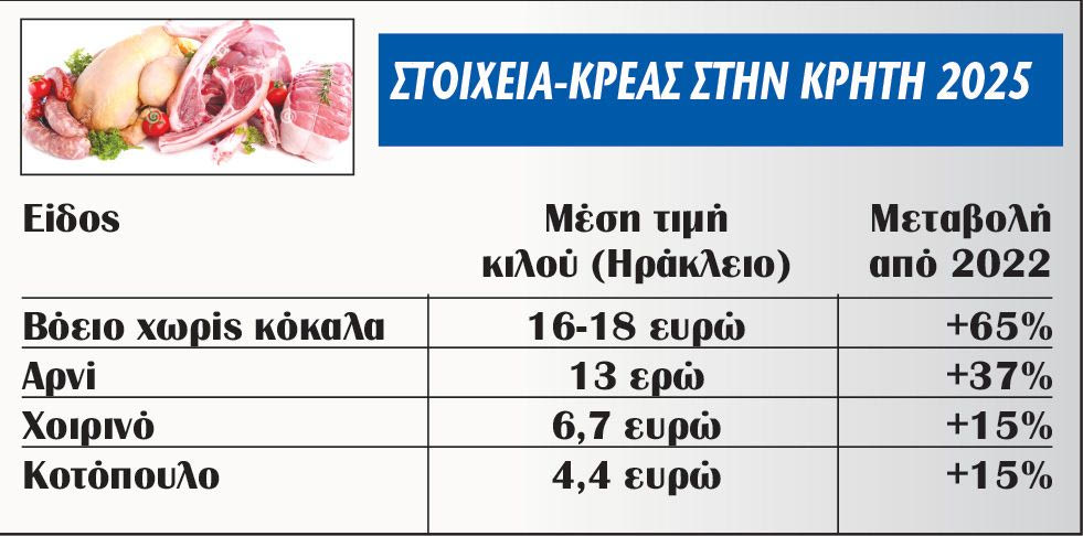 Τα στοιχεία της Περιφέρειας Κρήτης (Διεύθυνση Ανάπτυξης-Τμήμα Εμπορίου) αποτυπώνουν με ακρίβεια την άνοδο: το φθηνό κοτόπουλο, το «σταθερό» χοιρινό, το μοσχάρι και το αρνί έχουν ακριβύνει αισθητά, ενώ το βοδινό κρέας έχει εξελιχθεί σε είδος πολυτελείας.
