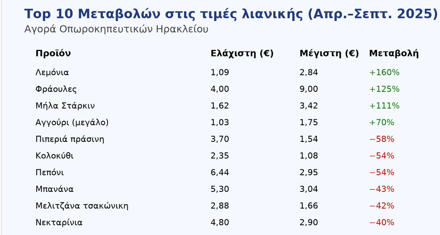 - Λεμόνια — από 1,09 €/kg (αρχές Απριλίου) έως 2,84 €/kg (Ιούλιος) → ≈+160%.