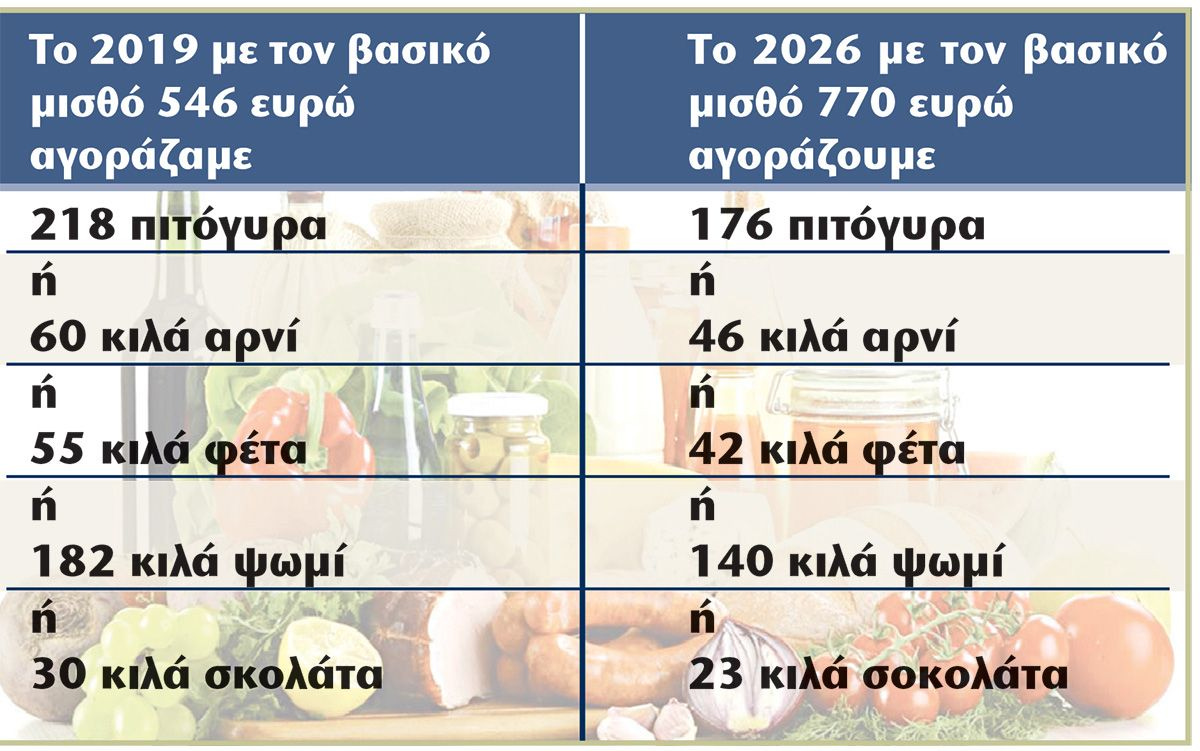 Τέλος, με τον βασικό μισθό του 2019, μπορούσαμε να αγοράσουμε 30 κιλά σοκολάτα, με τον βασικό του 2026, μόλις 23 κιλά».