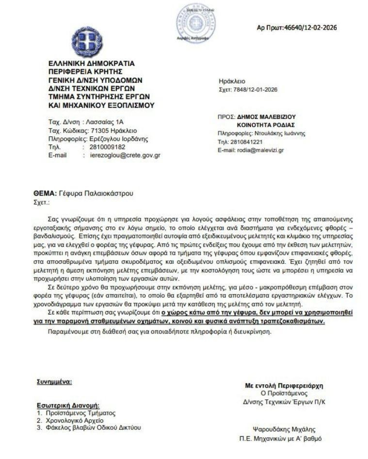 Πριν λίγες ημέρες έφτασε στο Κοινοτικό Γραφείο Ροδιάς έγγραφο της Διεύθυνσης Τεχνικών Έργων, το οποίο, αν και ασαφές ως προς το χρονοδιάγραμμα αποκατάστασης, είναι απολύτως σαφές ως προς τις απαγορεύσεις.