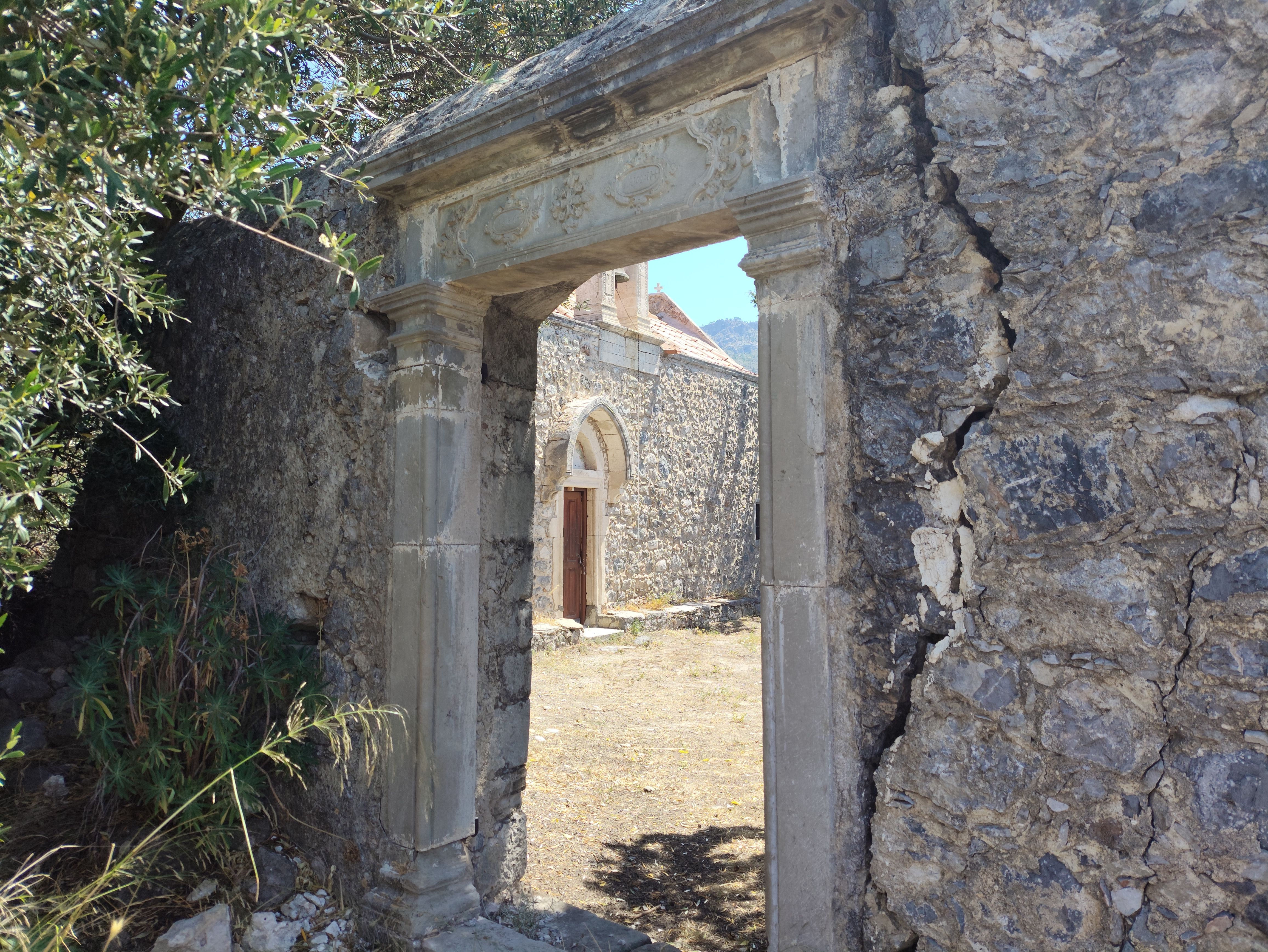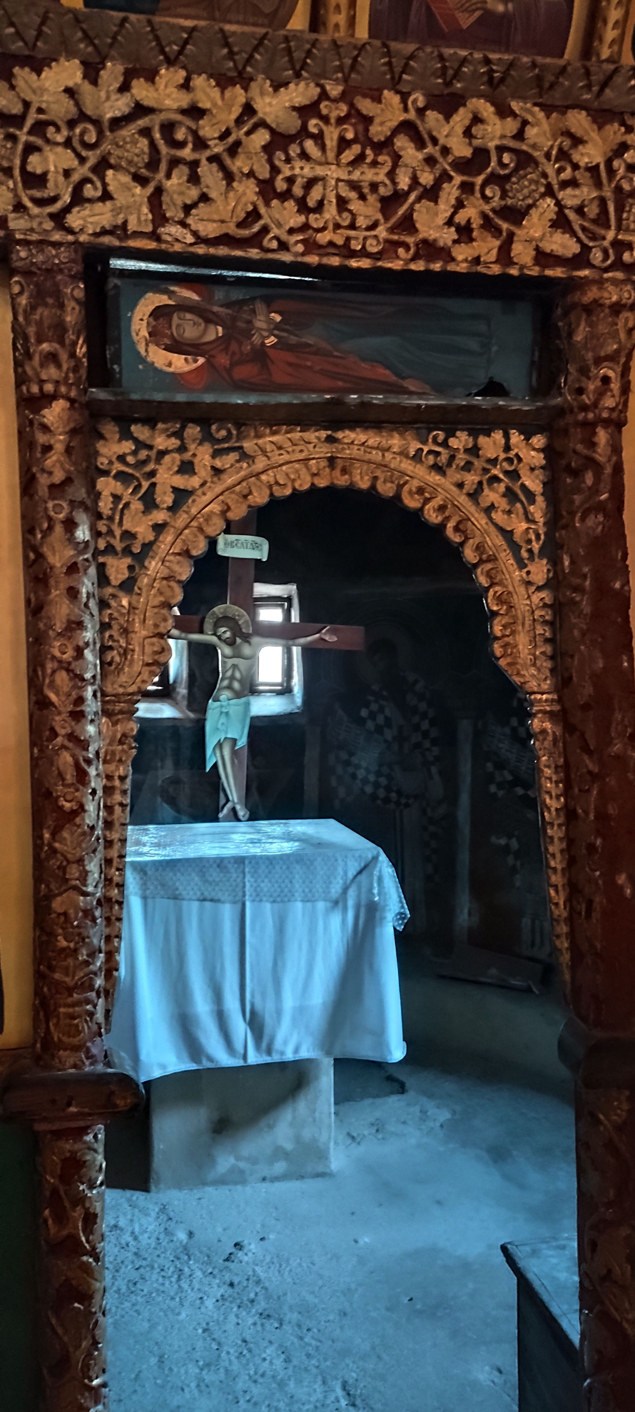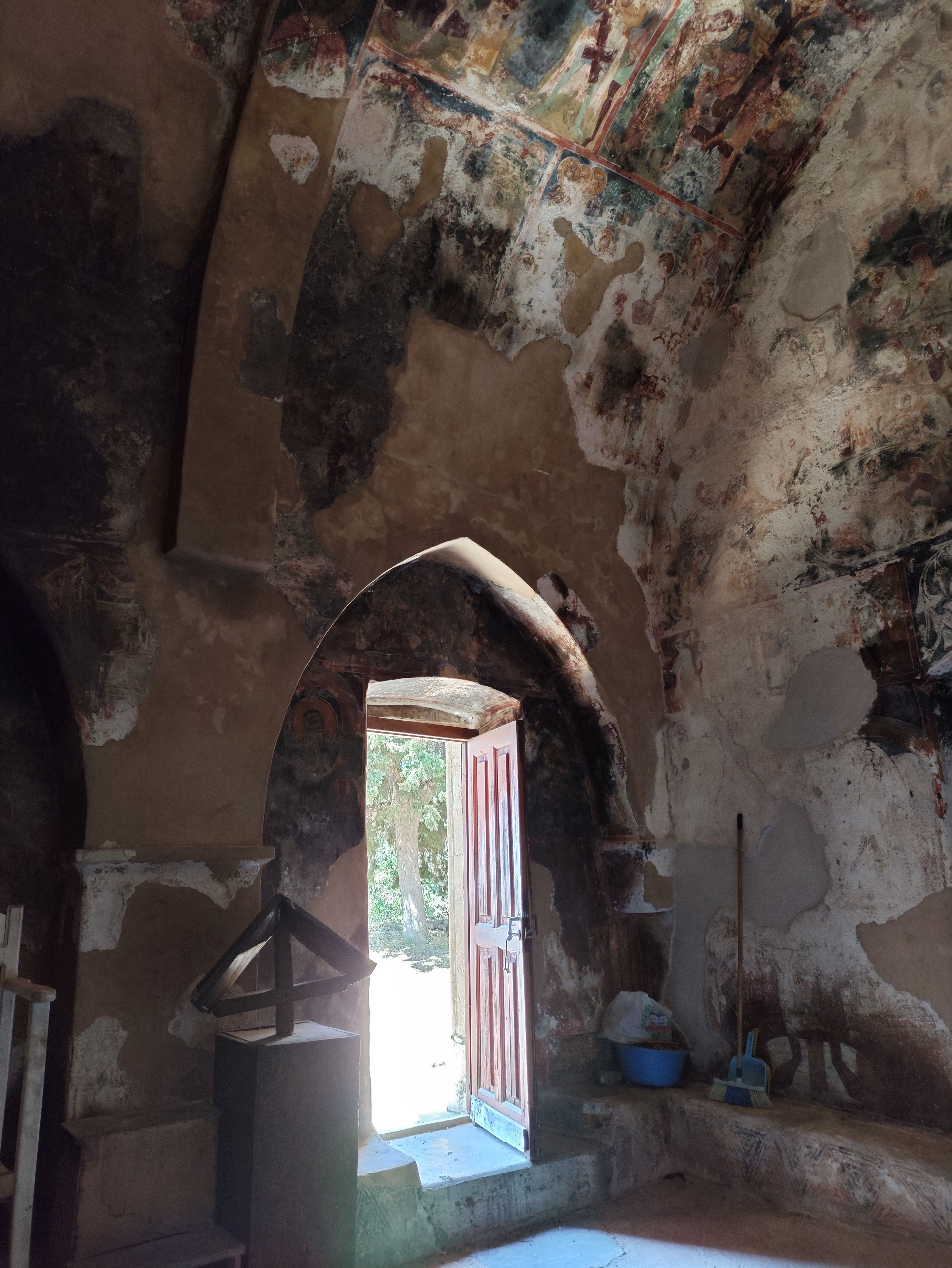 Η παλιά ξύλινη πόρτα στα πλάγια, τυλιγμένη στο λαξευτό πέτρινο περίγραμμά της άνοιξε φανερώνοντας έναν πολύ παλιό και ευρύχωρο ναό. Το φως λιγοστό μέσα του, αρκετό όμως για να φανούν οι μεταβυζαντινές αγιογραφίες που κοσμούν κάθε σπιθαμή του. Τα χρώματα, ακόμα. και. μετά από το πέρασμα του χρόνου παραμένουν ζωηρά. Σε κάποια σημεία οι αγιογραφίες δείχνουν να καλύπτονται απ΄ό στρώμα κάπνας, πιθανότατα από τα κεριά κι όχι από φωτιά. Άλλωστε όλος ο χώρος μυρίζει έντονα κερί, όπως συνηθίζεται σε τέτοιας ηλικίας εκκλησίες.