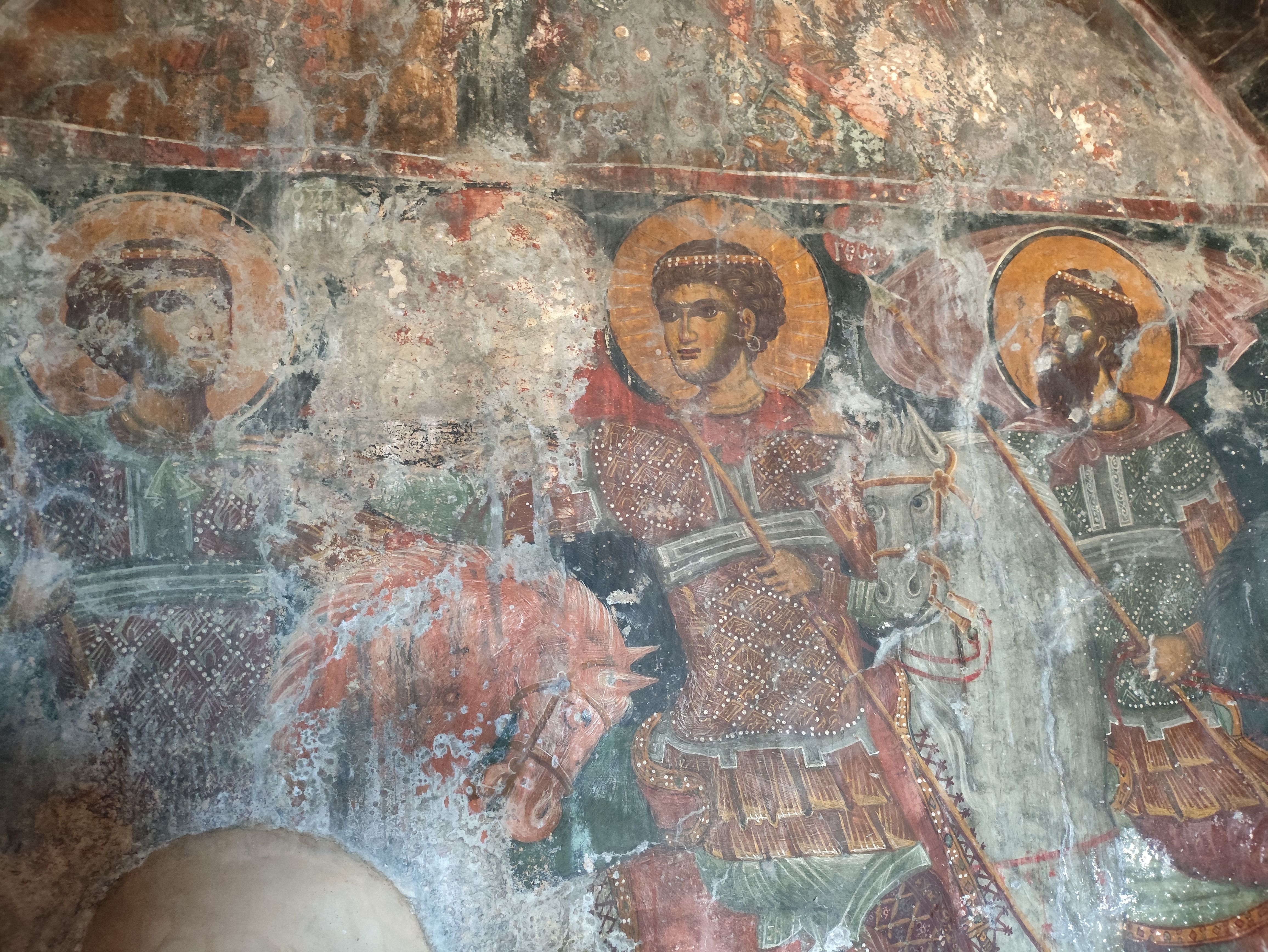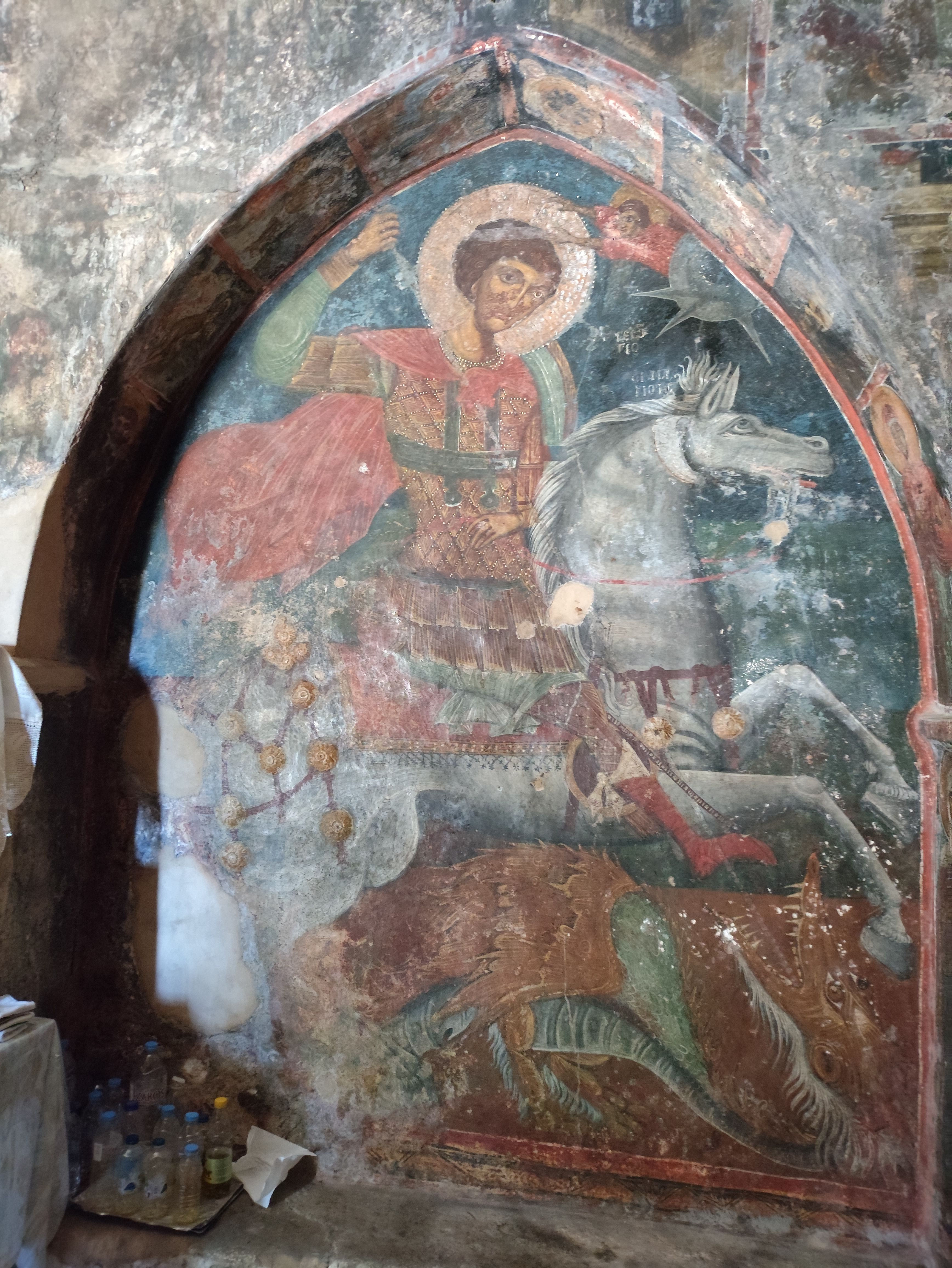 Το εικονογραφικό σύνολο του ναού, που ανάγεται στον 14ο αιώνα, προκαλεί το ενδιαφέρον με τις 30 περίπου εικονογραφήσεις του, κάποιες από τις οποίες μοιάζουν εν μέρει τουλάχιστον κατεστραμμένες. Δεσπόζει βέβαια σε ασυνήθιστο σημείο, στον βόρειο τοίχο, ένας τεράστιος Άγιος Γεώργιος. Ιδιαίτερα εντυπωσιακή και σπάνια η παράσταση των τριών έφιππων στρατιωτικών αγίων, Δημητρίου, Γεωργίου και Θεοδώρου, με άλογα διαφορετικού χρώματος. Συγκινητική επίσης η προσπάθεια του λαϊκού καλλιτέχνη να ζωγραφίσει διακοσμητικά μοτίβα σε κάθε σημείο της τοιχοποιΐας, γύρω από τις αγιογραφίες, ακόμα και στα πιο χαμηλά και δύσκολα.