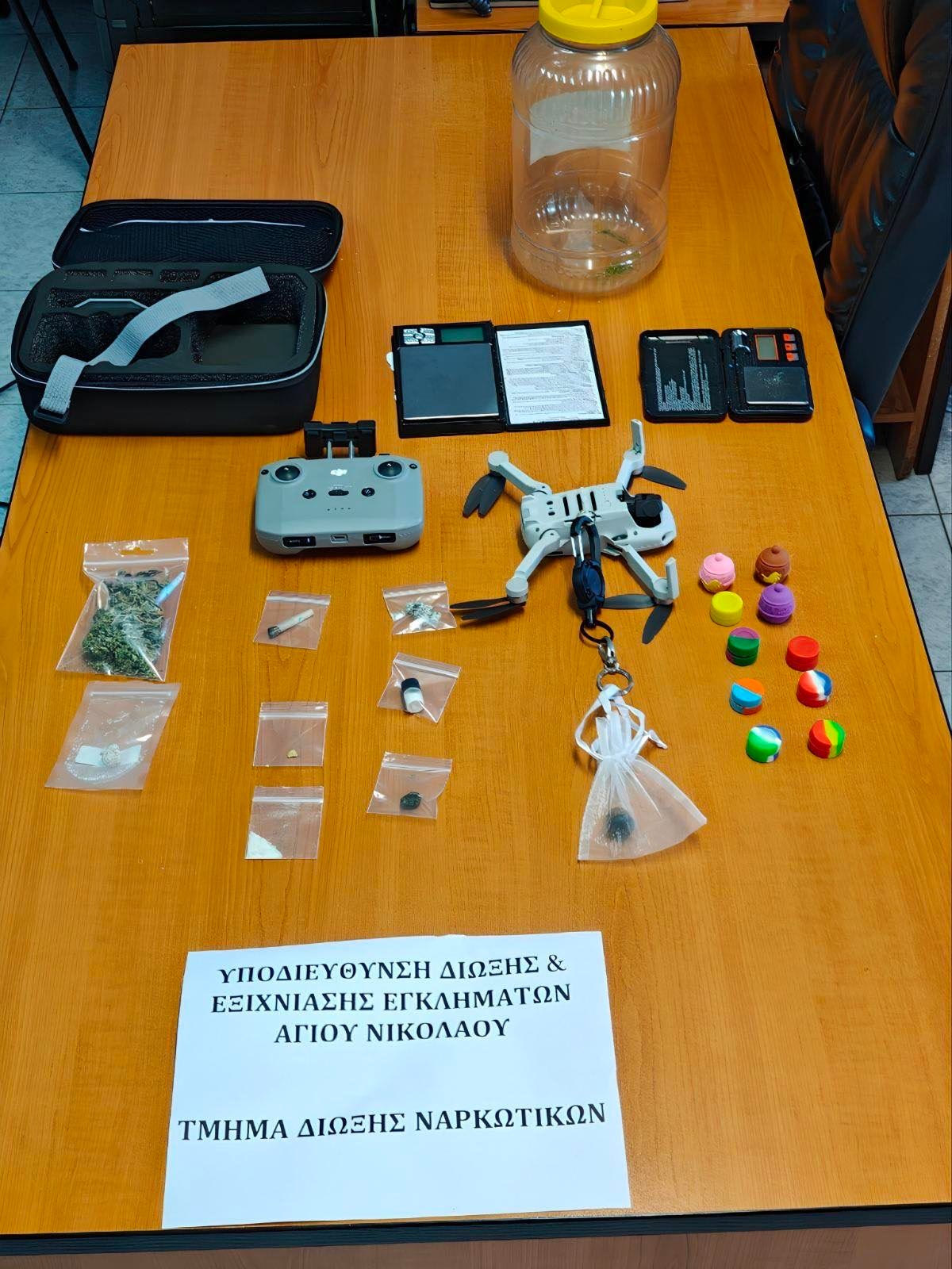Κατά τη διάρκεια της έρευνας βρέθηκαν και κατασχέθηκαν 15,1 γραμμάρια κάνναβη, μικροποσότητα κατεργασμένης κάνναβης τύπου σοκολάτας, μικροποσότητα μεθυλαινοδιοξυμεθαμφεταμίνης «MDMA», αυτοσχέδιο τσιγάρο με κάνναβη, μικροποσότητα έλαιου κάνναβης, (2) ζυγαριές ακριβείας, (1) drone με ειδικά προσαρμοσμένο γάντζο με πουγκί το οποίο περιείχε κρύπτη με υπολείμματα κάνναβης, (10) λαστιχένιες κρύπτες με υπολείμματα ακατέργαστης κάνναβης, (1) βάζο με υπολείμματα ακατέργαστης κάνναβης.