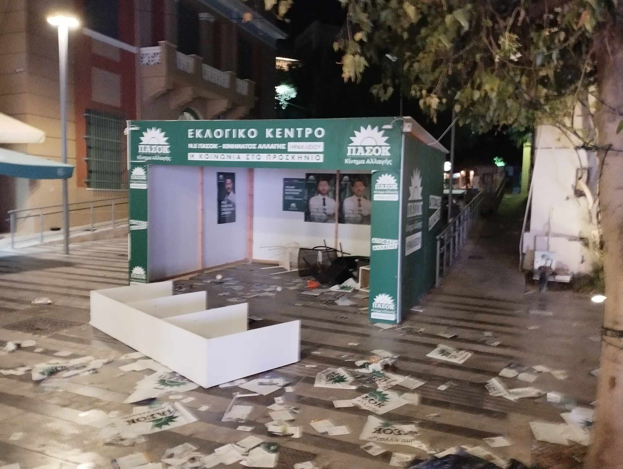 Το βράδυ του Σαββάτου, άγνωστοι κατέστρεψαν το προεκλογικό περίπτερο του ΠΑΣΟΚ, που βρίσκεται στο κέντρο της πόλης του Ηρακλείου, στη Λεωφόρο Δικαιοσύνης.