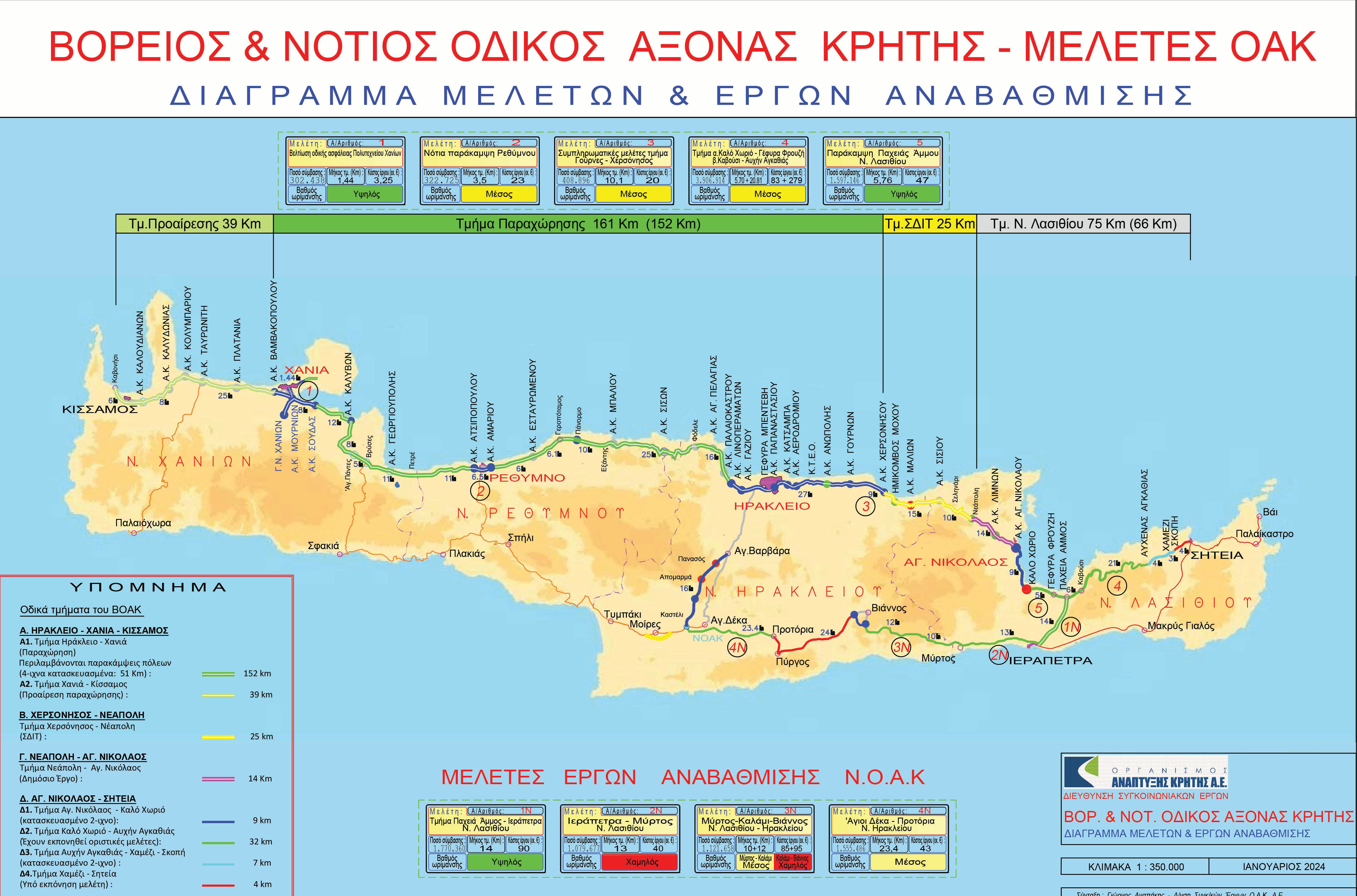 Σε ό,τι αφορά το τμήμα Μύρτος-Ιεράπετρα μήκους 13 χλμ., υπάρχει μελέτη που εκκρεμεί η έγκρισή της και το κόστος της εκτιμάται στα 40 εκατ. ευρώ. Υπερώριμο θεωρείται το τμήμα του έργου Ιεράπετρα-Παχειά Άμμος μήκους 14,00 χλμ., όπου υπάρχει εγκεκριμένη ΜΠΕ και εγκεκριμένα όλα τα στάδια των μελετών, μέχρι και την οριστική μελέτη και το συνολικό κόστος του έργου εκτιμάται σε 90 εκατ. ευρώ.