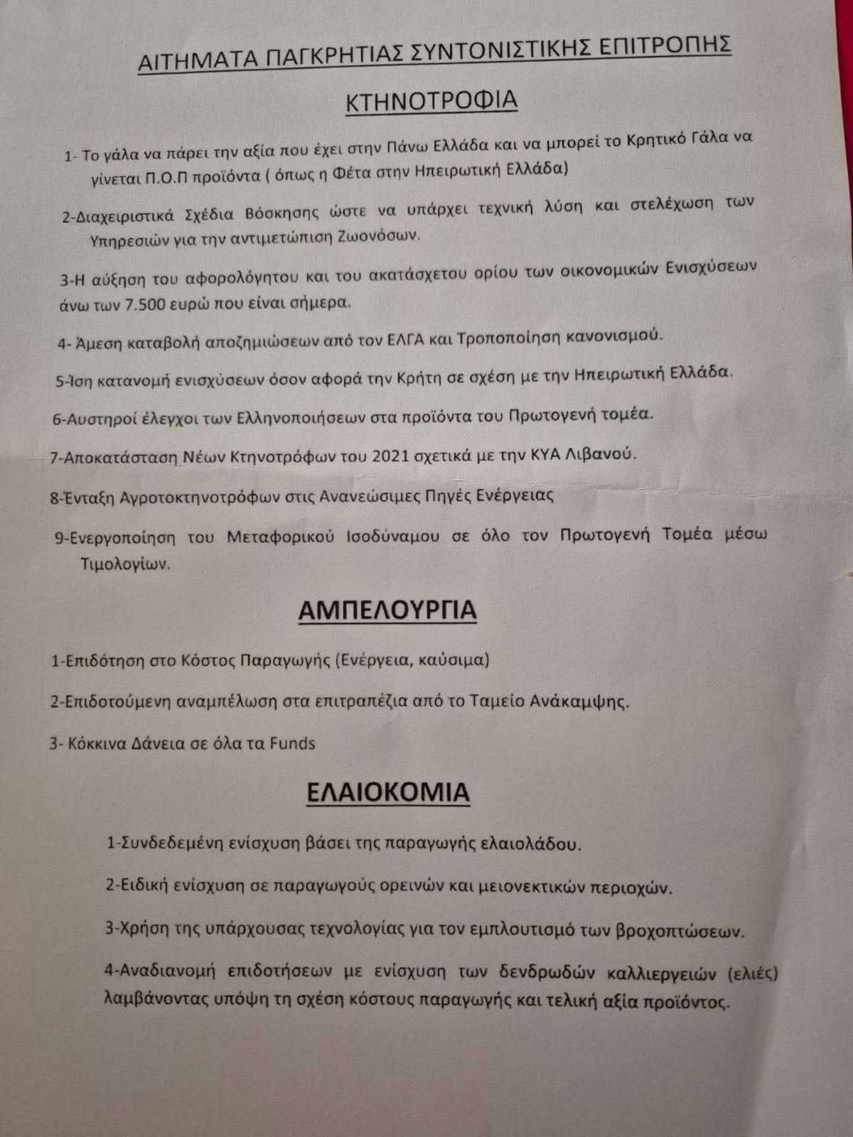 Η ανακοίνωση αναφέρεται στο παγκρήτιο συλλαλητήριο που πραγματοποιήθηκε στην περασμένη Τετάρτη στο Ηράκλειο και κάνει λόγο για ειλημμένες αποφάσεις σε σχέση με τις συσκέψεις που πραγματοποιήθηκαν υπό τον υπουργό Αγροτικής Ανάπτυξης Κώστα Τσιάρα, ο οποίος πραγματοποίησε περιοδεία την περασμένη εβδομάδα στην Κρήτη.