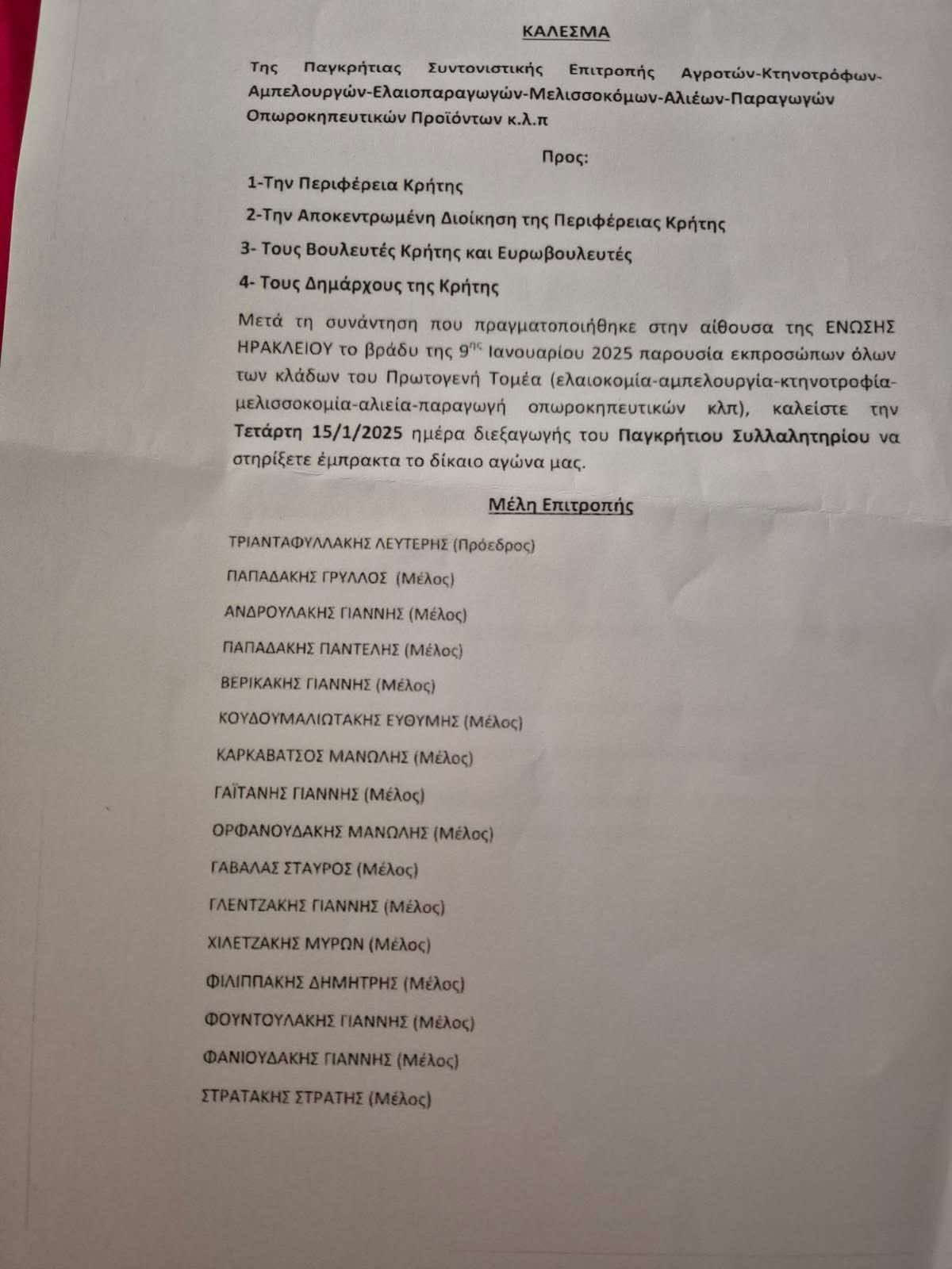 Θέμα: «Παγκρήτιο αγροτικό συλλαλητήριο 1/2025 – παρασκήνιο».