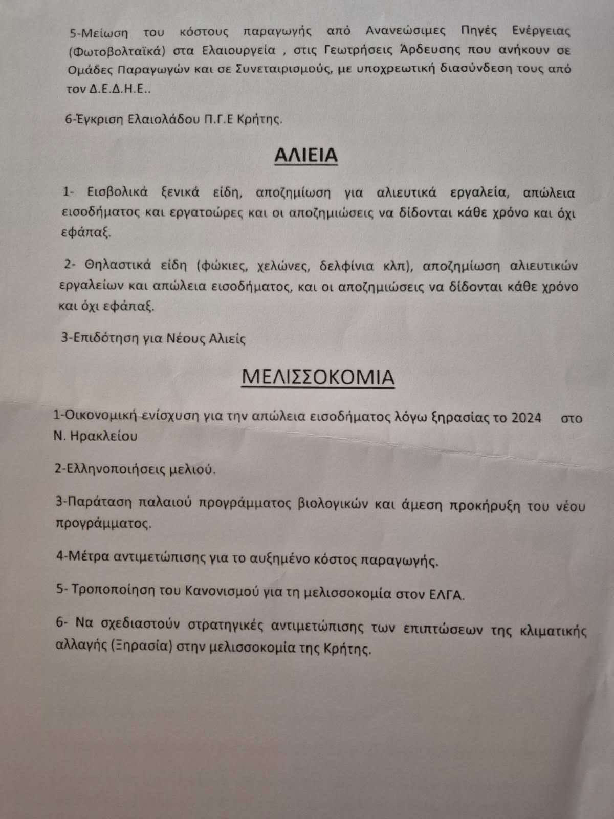 – Επειδή δεν δικαιούμαστε να είμαστε ανακόλουθοι στις απόψεις μας, συναντήσαμε τον ΥπΑΑΤ στην επίσκεψη του στο Λασίθι, ζητώντας απαντήσεις στην συγκεκριμένη λίστα αιτημάτων που του είχαμε θέσει τον 10/2024.