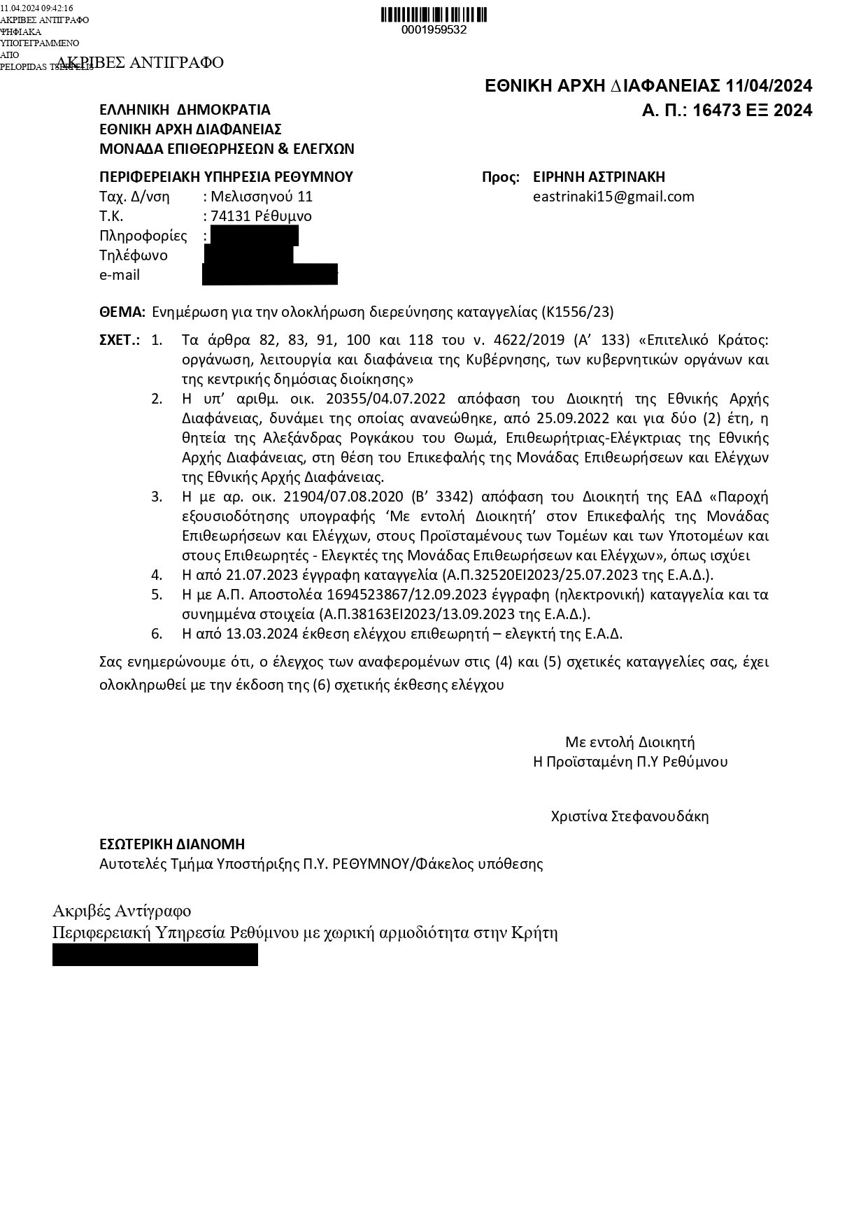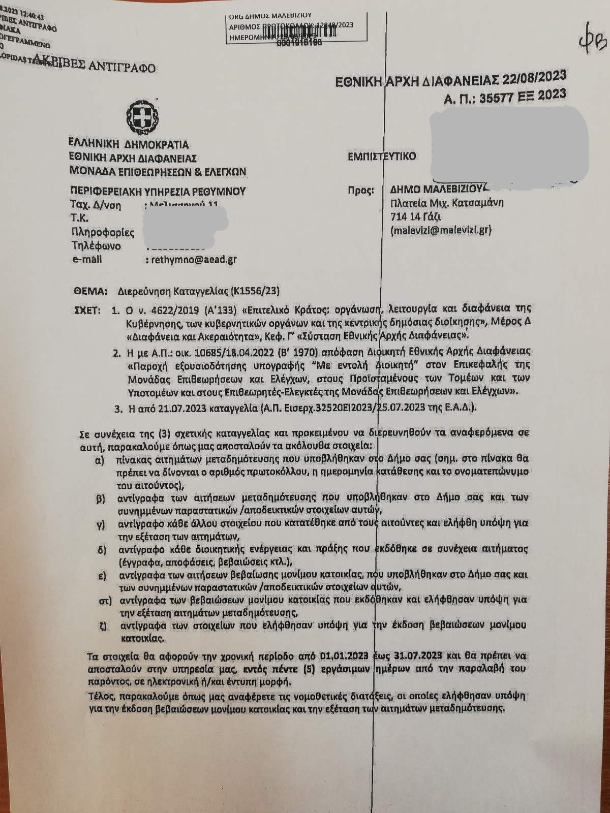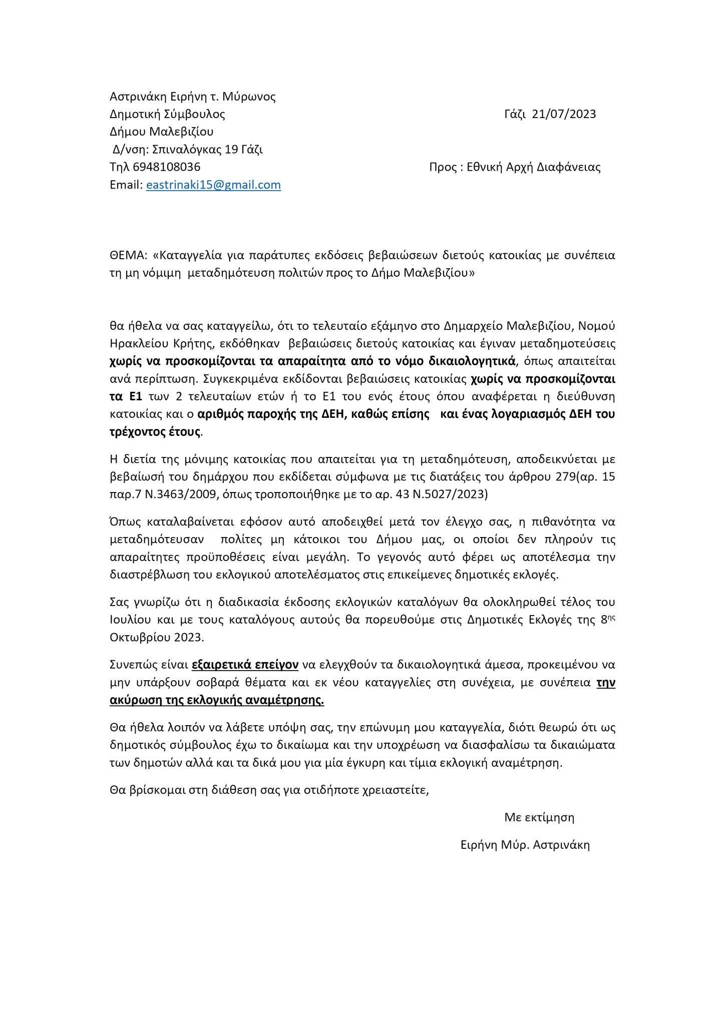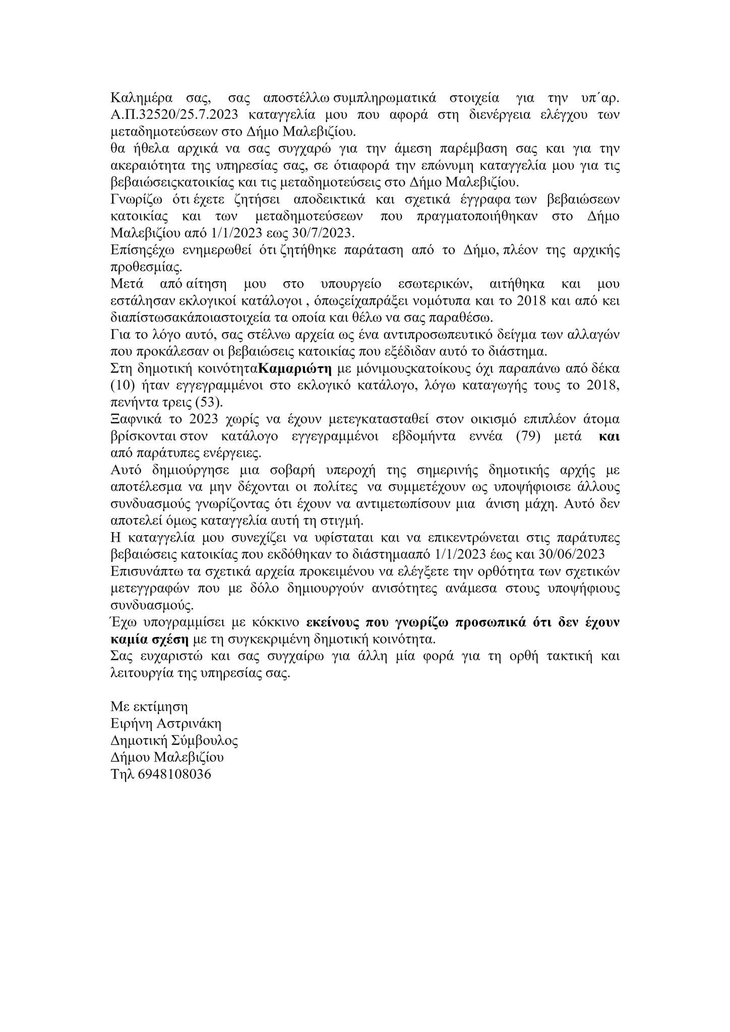 Η καταγγελία μου ήταν συγκεκριμένη και αναφερόταν στην περίοδο από 01/01/2023 έως και 30/6/2023 όπου εκδόθηκαν παράνομες αποφάσεις μεταδημοτεύσεων και βεβαιώσεων μόνιμης κατοικίας στο Δήμο, με σκοπό την αλλοίωση του εκλογικού αποτελέσματος. Παράλληλα αιτιολογώντας το κατεπείγον, ζητούσα την άμεση εξέταση του θέματος διότι ως τις 31/7/2023 θα γινόταν η οριστικοποίηση των εκλογικών κατάλογων, με το φόβο ότι θα συμπεριληφθούν σε αυτούς και οι παράνομες μεταδημοτεύσεις..