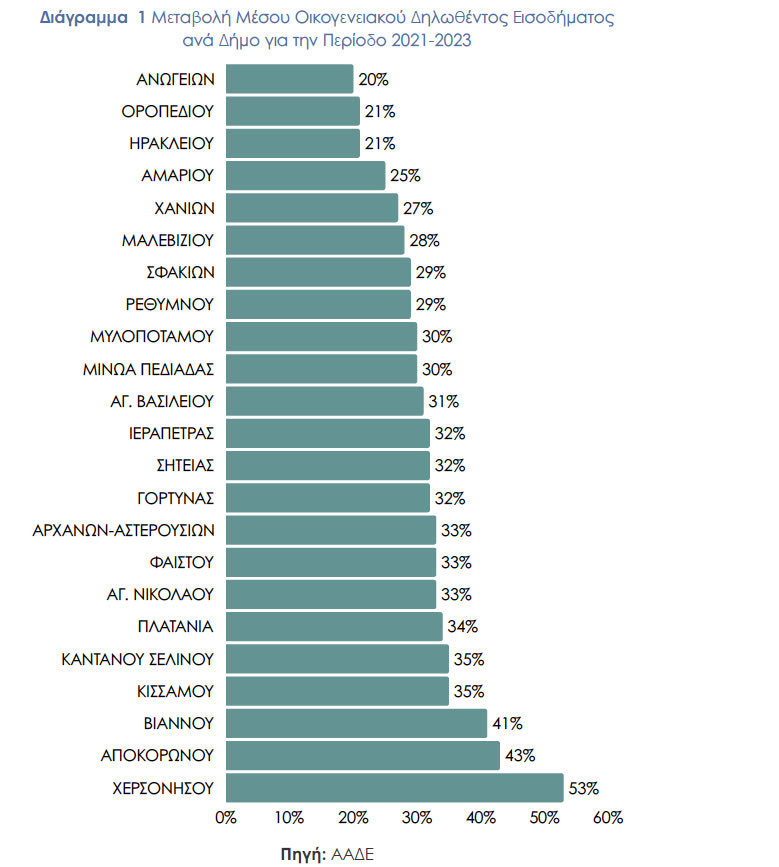 Σύμφωνα με τη μεταβολή του μέσου οικογενειακού εισοδήματος για την περίοδο 2021-2023, τη μεγαλύτερη άνοδο καταγράφει ο Δήμος Χερσονήσου +53%, ακολουθούμενος από τους Δήμους Αποκορώνου +43% και Βιάννου +41%. Αντίθετα, οι μικρότερες αυξήσεις εντοπίζονται στους Δήμους Ανωγείων 20%, Οροπεδίου Λασιθίου 21% και Ηρακλείου 21%.