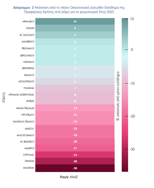 Ο Δήμος Μαλεβιζίου βρίσκεται κοντά στον μέσο όρο της Περιφέρειας, ενώ οι Δήμοι Ανωγείων -38% και Σφακίων -30% καταγράφουν σημαντικά χαμηλότερα επίπεδα εισοδήματος.