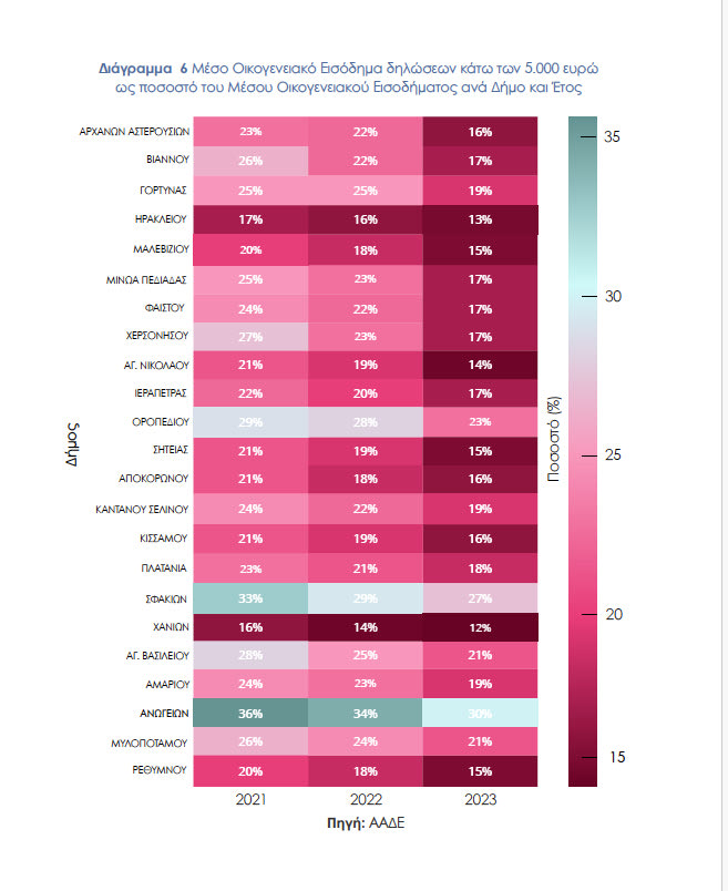 Ενδεικτικά, στους Δήμους Ανωγείων και Σφακίων, πάνω από το 50% των φορολογικών δηλώσεων παραμένει σταθερά κάτω των 5.000 ευρώ, γεγονός που αναδεικνύει την ανθεκτικότητα της εισοδηματικής φτώχειας σε αυτές τις περιοχές. Παρατηρούμε ότι υπάρχουν έντονες ανισότητες μεταξύ των Δήμων της Ανατολικής και της Δυτικής Κρήτης.