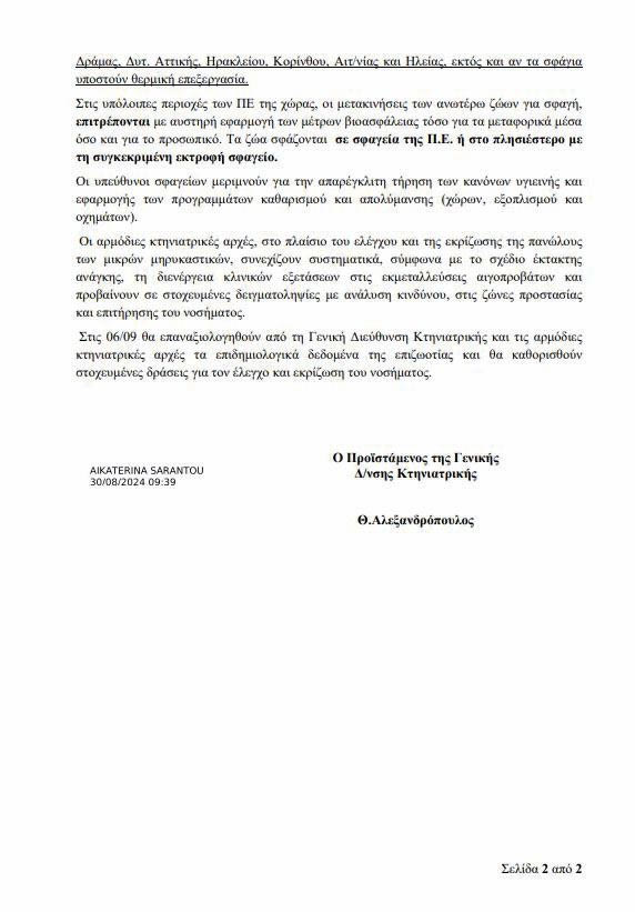 3 Οι μετακινήσεις για την σφαγή των ανωτέρω ζώων απαγορεύονται από και εντός των ζωνών προστασίας και επιτήρησης στις ΠΕ Τρικάλων, Λάρισας, Καρδίτσας, Ροδόπης, Δράμας, Δυτ. Αττικής, Ηρακλείου, Κορίνθου, Αιτωλοακαρνανίας και Ηλείας, εκτός και εάν τα σφάγια υποστούν θερμική επεξεργασία.