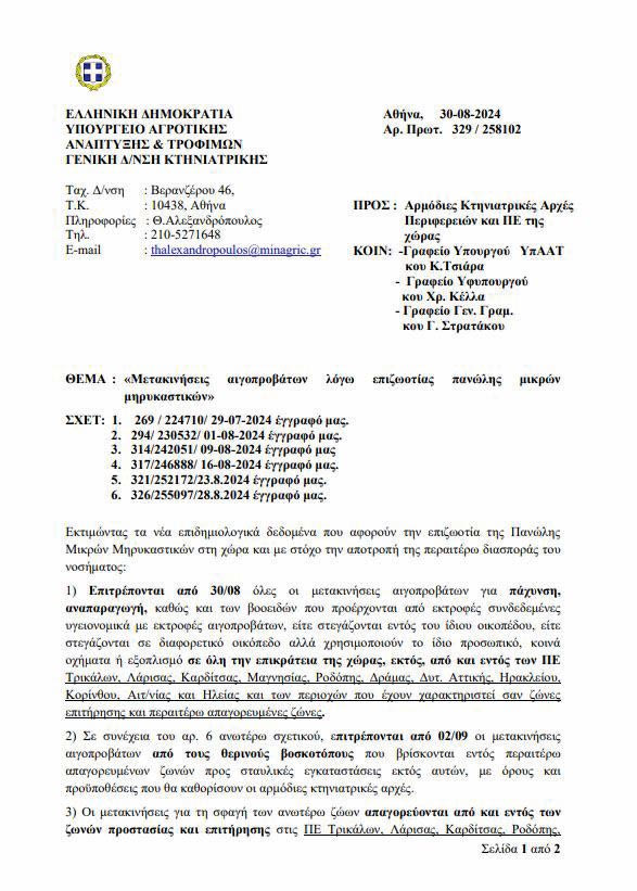 1 Επιτρέπονται από 30/8 όλες οι μετακινήσεις αιγοπροβάτων για πάχυνση, αναπαραγωγή, καθώς και των βοοειδών που προέρχονται από εκτροφές συνδεδεμένες υγειονομικά με εκτροφές αιγοπροβάτων, είτε στεγάζονται εντός του ίδιου οικοπέδου, είτε στεγάζονται σε διαφορετικά οικόπεδα, αλλά χρησιμοποιούν το ίδιο προσωπικό, κοινά οχήματα ή εξοπλισμό σε όλη την επικράτεια της χώρας, εκτός από και εντός των ΠΕ Τρικάλων, Λάρισας, Καρδίτσας, Μαγνησίας, Ροδόπης, Δράμας, Δυτ. Αττικής, Ηρακλείου, Κορίνθου, Αιτωλοακαρνανίας και Ηλείας και των περιοχών που έχουν χαρακτηριστεί σαν ζώνες επιτήρησης και περαιτέρω απαγορευμένες ζώνες.