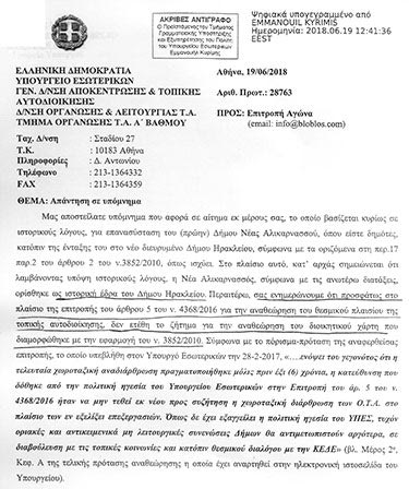 Στο υπόμνημα της Επιτροπής Αγώνα απάντησε με έγγραφό του το Υπουργείο Εσωτερικών, το οποίο υπογράφεται από τον γενικό γραμματέα του Υπουργείου Κώστα Πουλάκη. Στο πλαίσιο της απάντησης υπενθυμίζεται ότι για λόγους ιστορικότητας, τους οποίους και επικαλείται η Επιτροπή Αγώνα, ο Δήμος Νέας Αλικαρανσσού έχει αναγνωριστεί ως ιστορική έδρα του Καλλικρατικού Δήμου Ηρακλείου. Υπάρχει παράλληλα η επισήμανση ότι ούτε στον νέο νόμο 4368 του 2016 υπήρξε κάποια σκέψη για την αναδιάρθρωση των υφιστάμενων Καλλικρατικών Δήμων χωροταξικά, με δεδομένο ότι η τελευταία χωροταξική αναδιάρθρωση πραγματοποιήθηκε πριν από μόλις έξι χρόνια.