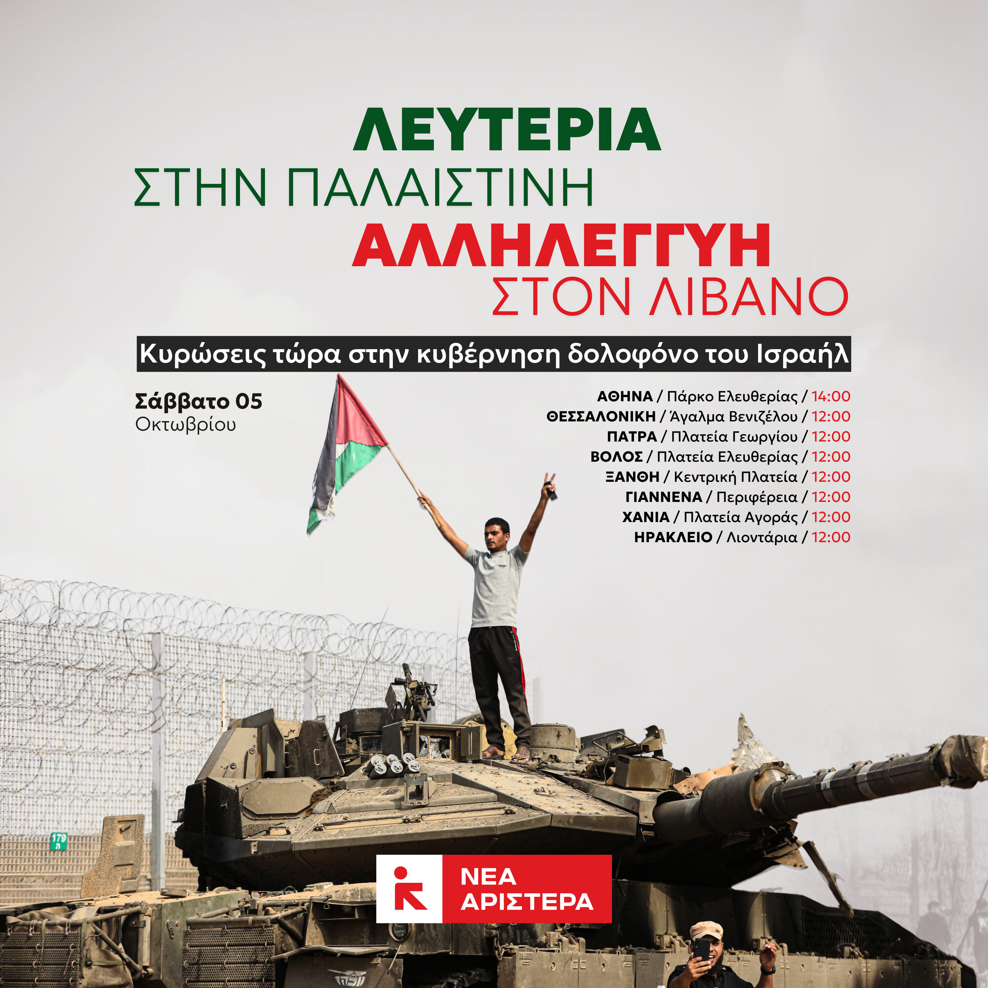 «Η ακροδεξιά κυβέρνηση Νετανιάχου συνεχίζει την γενοκτονία του Παλαιστινιακού λαού, εισβάλει στο Λίβανο και απειλεί με συνολική ανάφλεξη όλη τη Μέση Ανατολή. Ταυτόχρονα, η κυβέρνηση της ΝΔ αντί να αναλάβει πρωτοβουλίες για την ειρήνη, παραβλέποντας τους ορατούς κινδύνους για την περιοχή μας, συνεχίζει να αποτελεί κρίσιμο σύμμαχο της φιλοπόλεμης κυβέρνησης Νετανιάχου