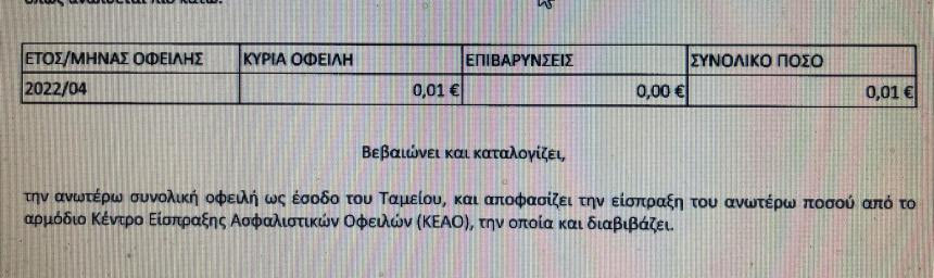 Σύμφωνα με καταγγελία του στην εφημερίδα «Ρέθεμνος» χρειάστηκαν δύο μήνες για να βρει ότι χρωστάει στον ΕΦΚΑ το ιλιγγιώδες ποσόν του 1 λεπτού που ήταν η αιτία να παραμένει η σύζυγός του ανασφάλιστη από τον Απρίλιο του 2022.