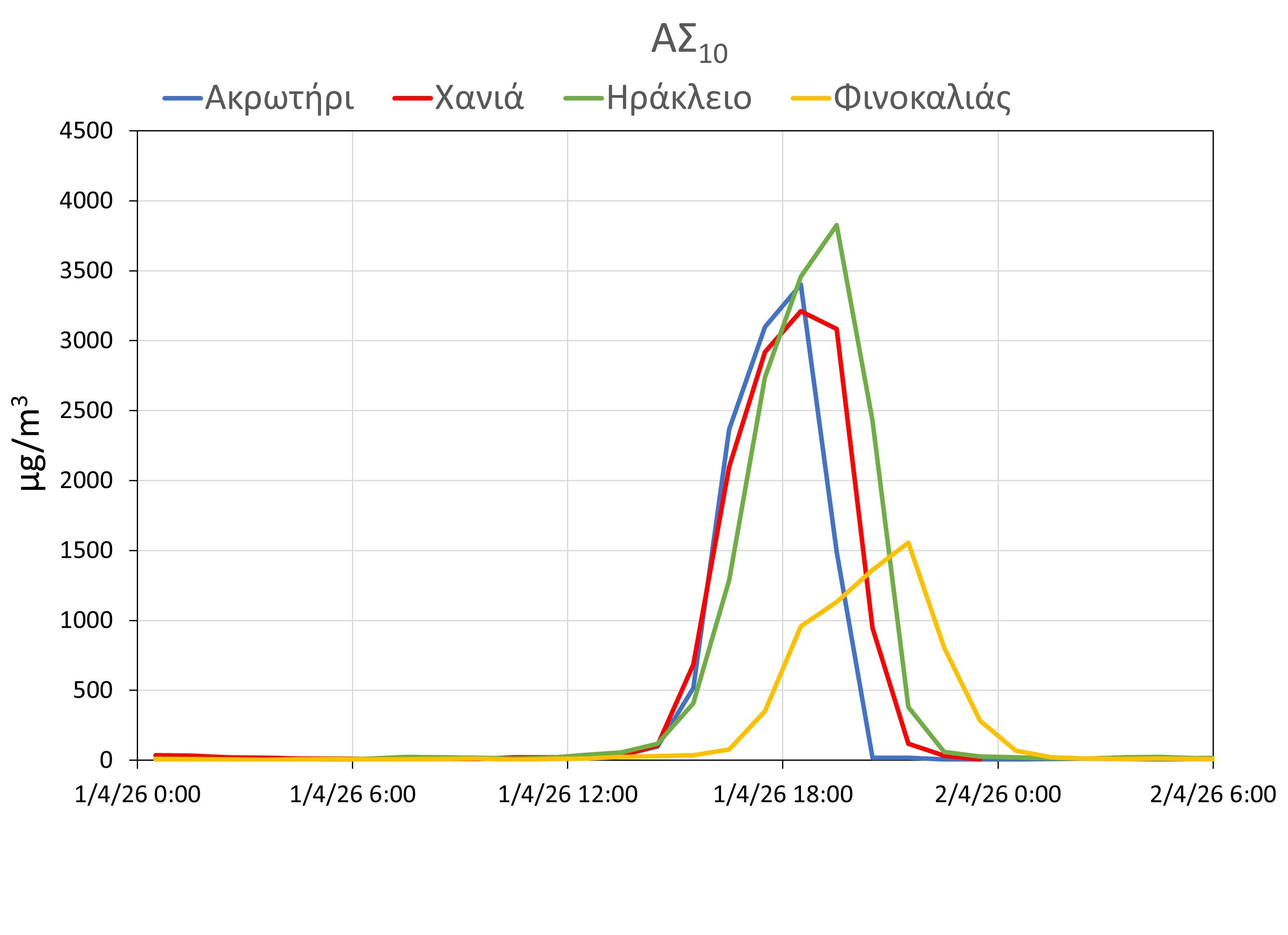 Οι μέγιστες συγκεντρώσεις σκόνης που παρατηρηθήκαν (ωριαίες τιμές) ήταν 3211 μg/m3 στα Χανιά, 3402 μg/m3 στο Ακρωτήρι, 3826 μg/m3 στο Ηράκλειο και 1555 μg/m3 στο Φινοκαλιά. Η οριακή τιμή για την ανθρώπινη υγεία βάσει της ισχύουσας νομοθεσίας είναι τα 50 μg/m3 (μέση ημερήσια τιμή), και παρατηρήθηκε υπέρβαση σε όλη την Κρήτη με υπερδεκαπλάσιες συγκεντρώσεις των ορίων. Το επεισόδιο σκόνης συνεχίζεται και σήμερα 02 Απριλίου με χαμηλότερες μέχρι στιγμής συγκεντρώσεις.