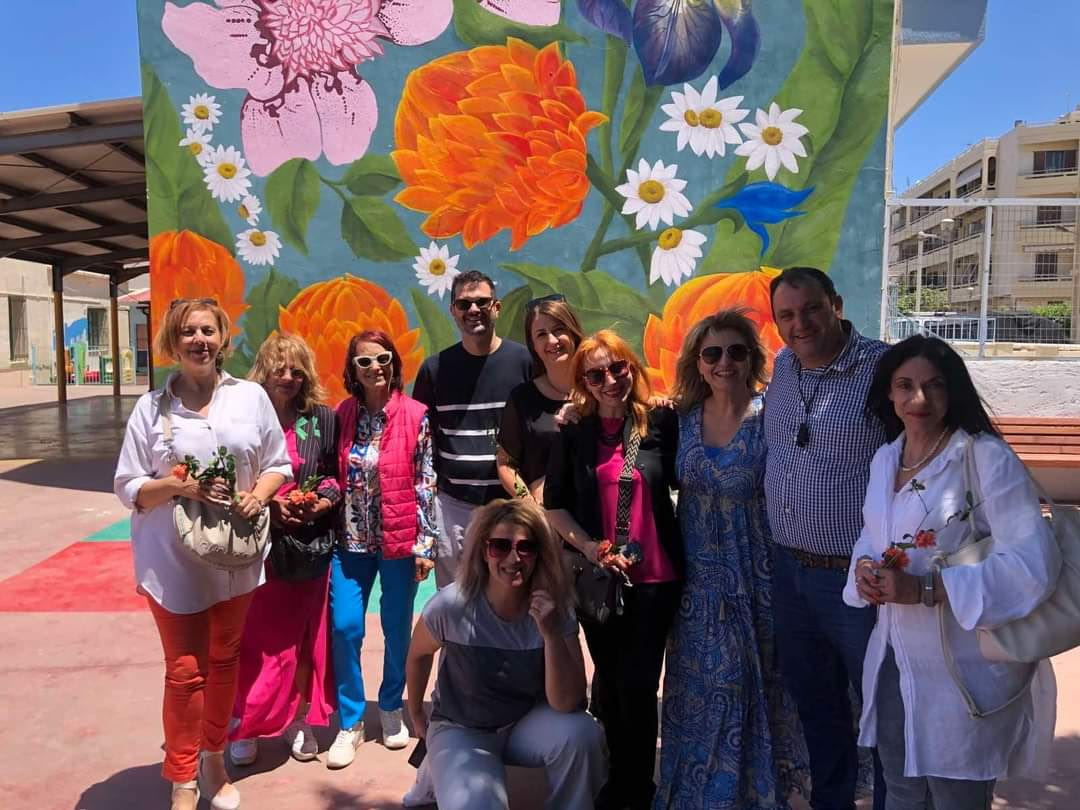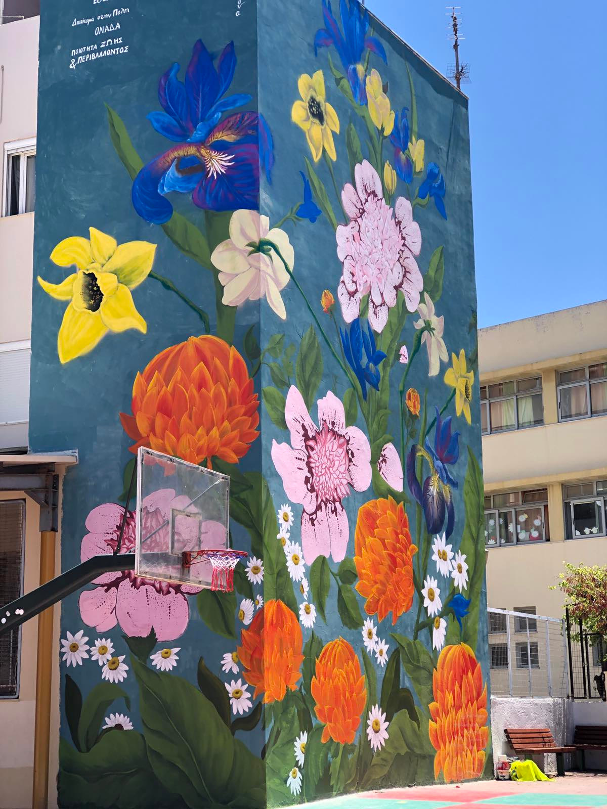 Η ομάδα των εθελοντών, με πρωτοβουλία της Γωγώς Πιλάτου και την τέχνη της εικαστικού Νίκης Γκοράνοβα, ζωγράφισαν έναν ολόκληρο τοίχο με λουλούδια και τον χάρισαν όχι μόνο στους μαθητές του σχολείου, αλλά και σε ολόκληρη την πόλη μας!