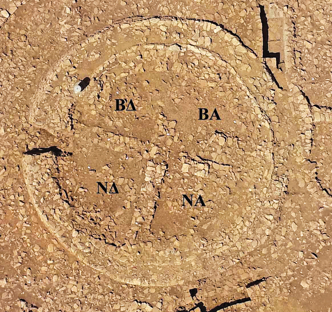 Tο θεμέλιο του συγκεκριμένου κτηρίου στην Τίρυνθα αποτελούν ένας κύκλος με διάμετρο 6 μέτρα, διαμορφωμένος στο βράχο, και ομόκεντροι κυκλικοί τοίχοι από ωμόπλινθους. Η κολοσσιαία αυτή κατασκευή, συνολικής διαμέτρου 27,9 μέτρων, μοναδική στο Αιγαίο, αποτελεί έργο συλλογικής εργασίας των κατοίκων της πρωτοελλαδικής Τίρυνθας.