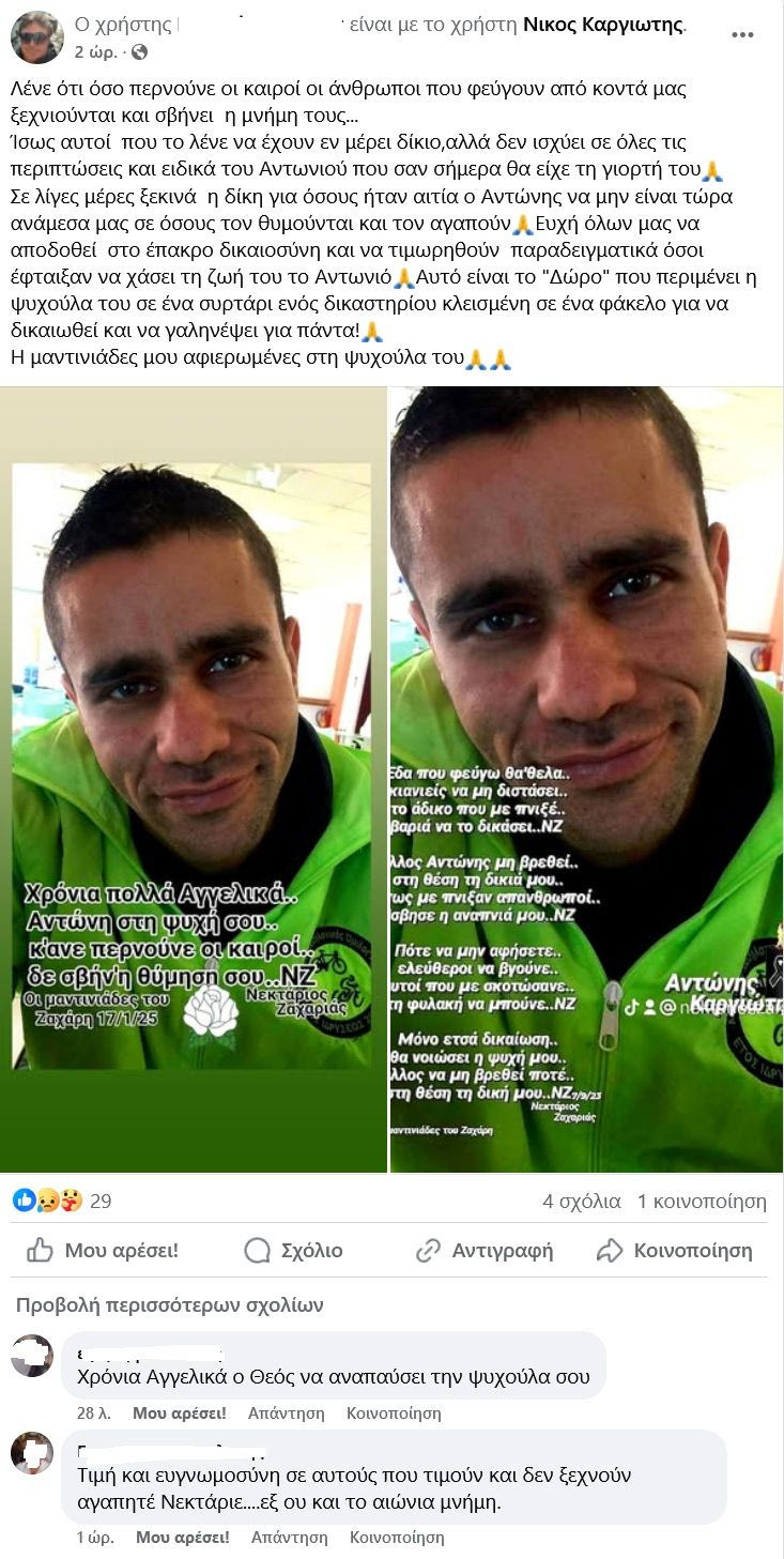 Ο αδελφός του Νίκος Καργιώτης και ένας φίλος του άτυχου Αντώνη με αφορμή την ονομαστική του εορτή κάνουν μία συγκλονιστική ανάρτηση στην οποία ζητούν μεταξύ άλλων την παραδειγματική τιμωρία των ενόχων.