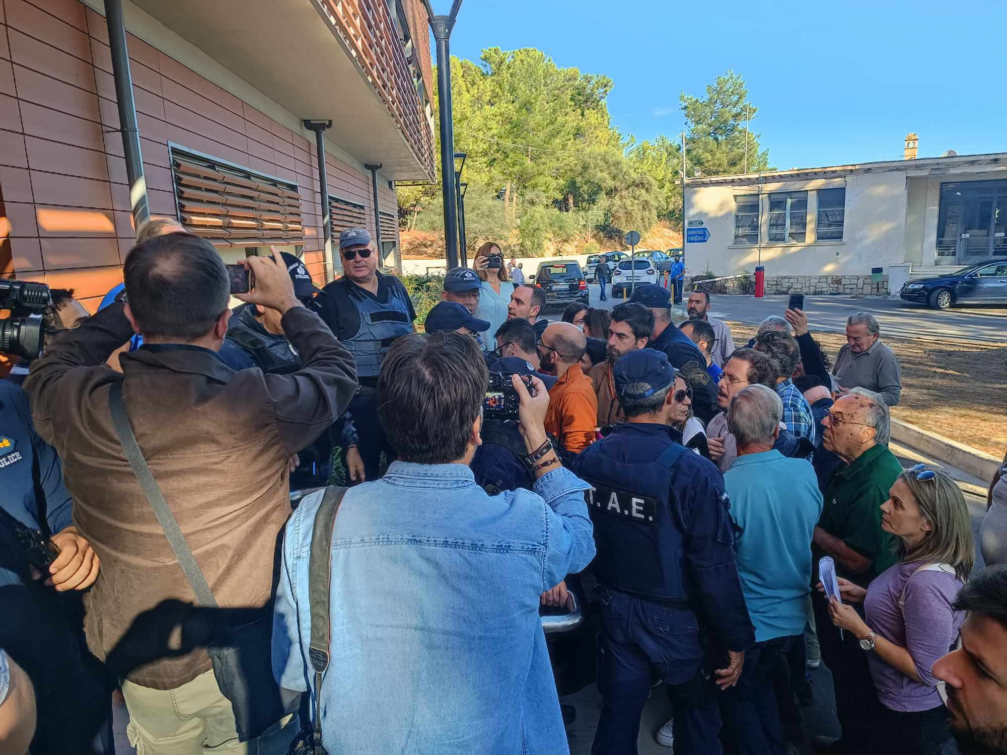Στο μεταξύ, ένταση σημειώθηκε κατά την είσοδο του Υπουργού στην αίθουσα συσκέψεων καθώς δεν επιτράπηκε η είσοδος στους διαδηλωτές.