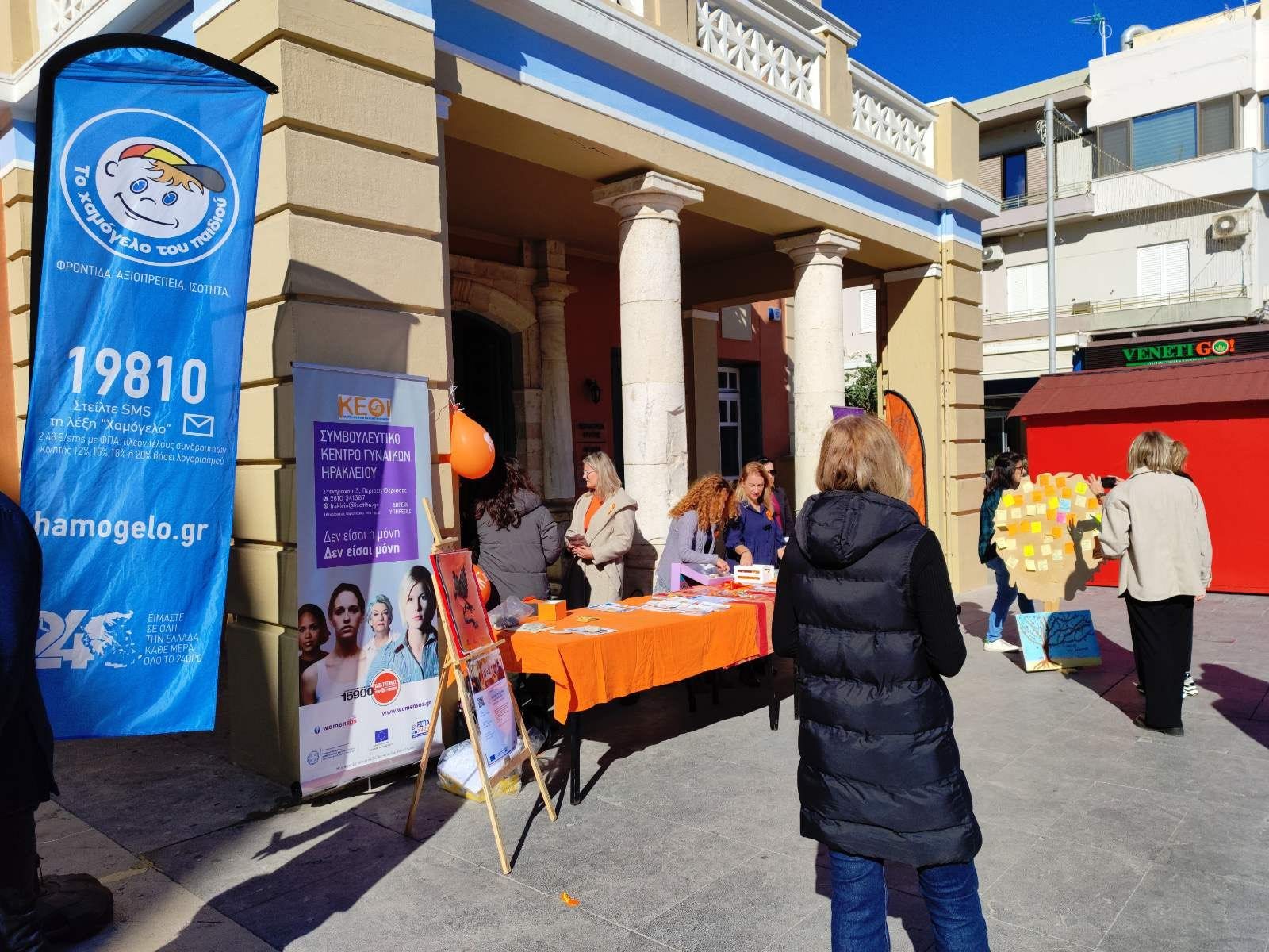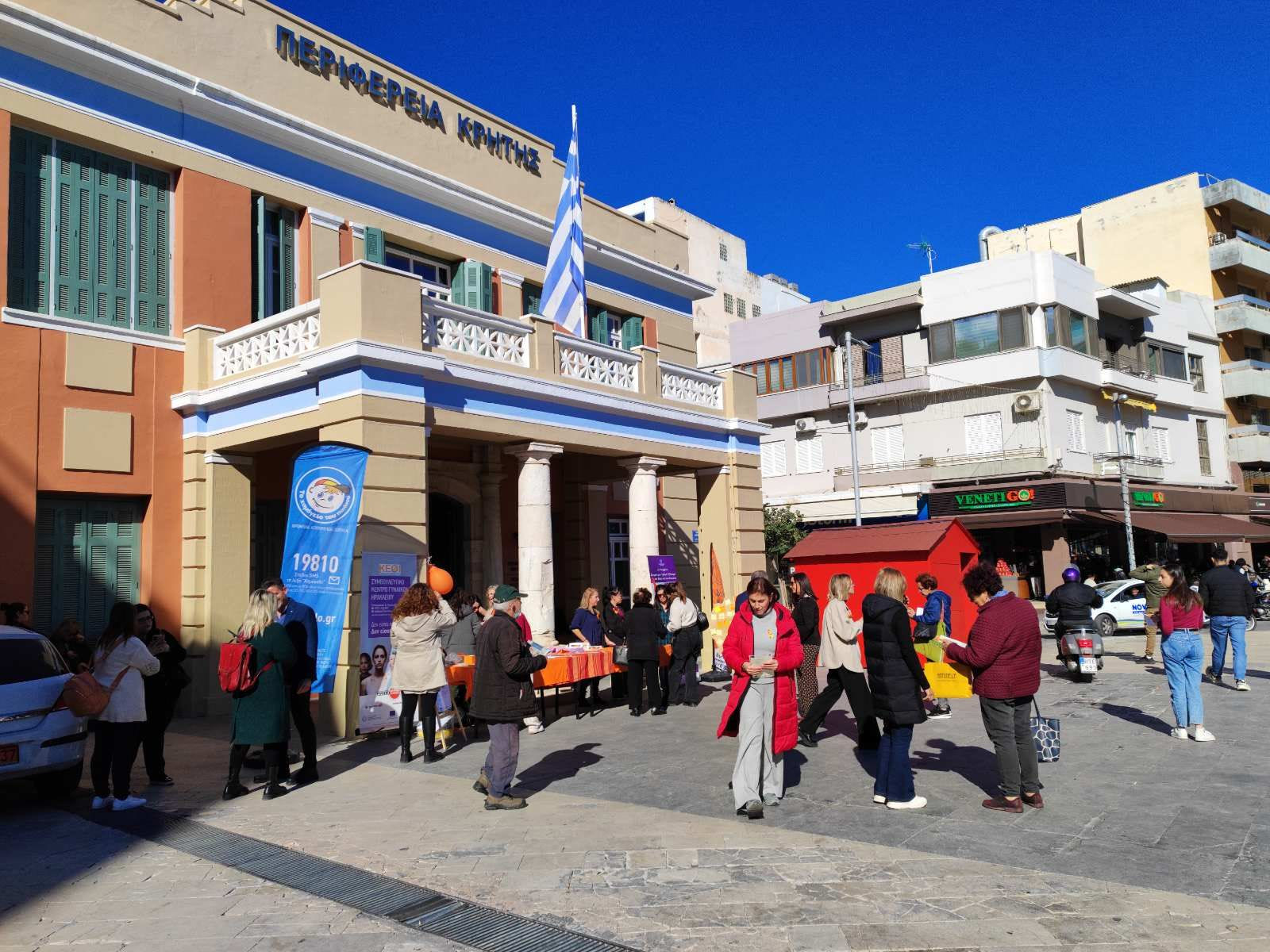 Δεκάδες Ηρακλειώτες βρέθηκαν στην πλατεία Ελευθερίας μπροστά από το κτήριο της Περιφέρειας όπου πραγματοποιείται Εκστρατεία ενημέρωσης, προβληματισμού και ευαισθητοποίησης, με τίτλο: «16ήμερες Δράσεις για την Πρόληψη και την Καταπολέμηση της Βίας κατά των Γυναικών και των Κοριτσιών».