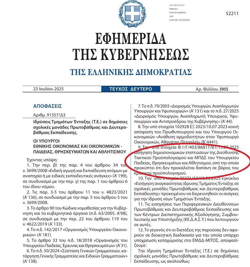 Είναι χαρακτηριστικό ότι στο ΦΕΚ, όπου ανακοινώνεται η δημιουργία των νέων τμημάτων ένταξης, αναφέρεται ότι: «δεν προκύπτει δαπάνη σε βάρος του κρατικού προϋπολογισμού», πράγμα το οποίο σημαίνει ότι το Υπουργείο δεν έχει καμία πρόθεση να αναλάβει τις ευθύνες του στη σχολική στέγη, την ίδια ώρα που ζητά να λειτουργήσουν, από 1η Σεπτέμβρη, 98 νέα τμήματα ένταξης σε επίπεδο νομού.
