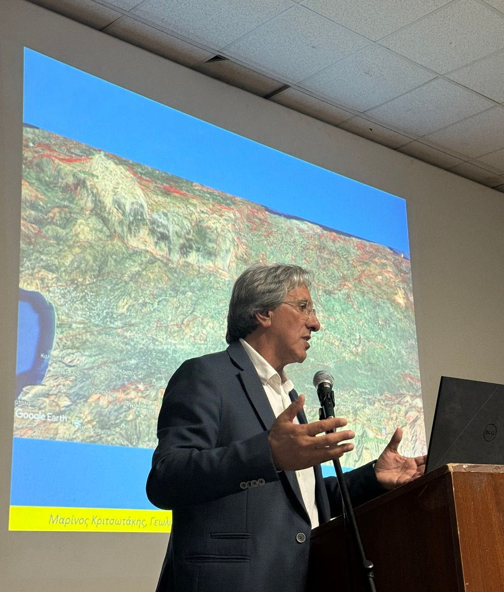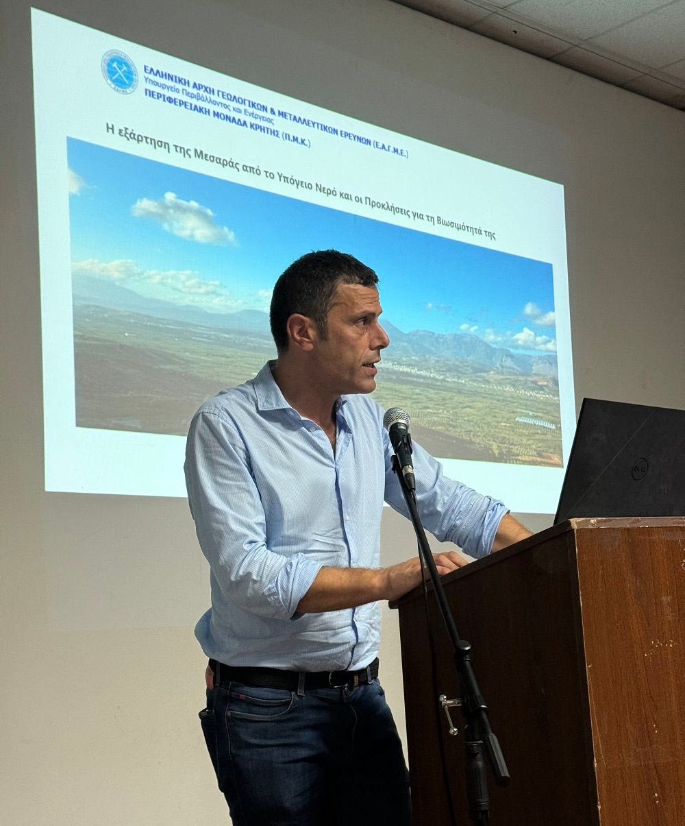 Την εκδήλωση πλαισίωσαν δύο βασικοί εισηγητές, ο κ. Κριτσωτάκης Μαρίνος, Γενικός Διευθυντής Βιώσιμης Ανάπτυξης της Περιφέρειας Κρήτης, που μίλησε για την ανάγκη ενιαίου σχεδιασμού και διαχείρισης του νερού με αναφορά στα περιφερειακά σχέδια για την Κρήτη και ο κ. Μιχαλάκης Γιάννης, Προϊστάμενος της Περιφερειακής Μονάδας Κρήτης της Ε.Α.Γ.Μ.Ε., που παρουσίασε την υδρογεωλογική κατάσταση της περιοχής Μεσαράς, με έμφαση στη μείωση των υπόγειων υδάτων και την ανάγκη για επιστημονικά τεκμηριωμένη διαχείριση.