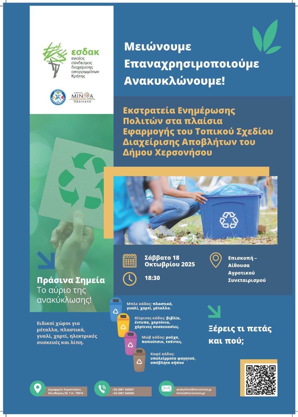 Ο Δήμος Χερσονήσου και ο Ενιαίος Σύνδεσμος Διαχείρισης Απορριμμάτων Κρήτης (Ε.Σ.Δ.Α.Κ.) προσκαλούν τους πολίτες σε μια σειρά ανοιχτών ενημερωτικών εκδηλώσεων με θέμα «Εκστρατεία ενημέρωσης των πολιτών, στα πλαίσια εφαρμογής του Τοπικού Σχεδίου Διαχείρισης Αποβλήτων, του Δήμου Χερσονήσου».