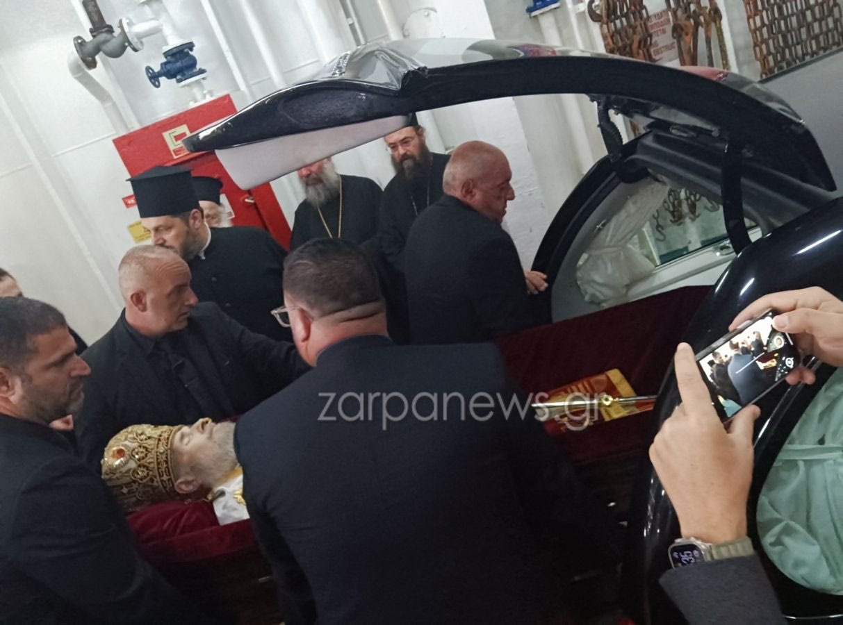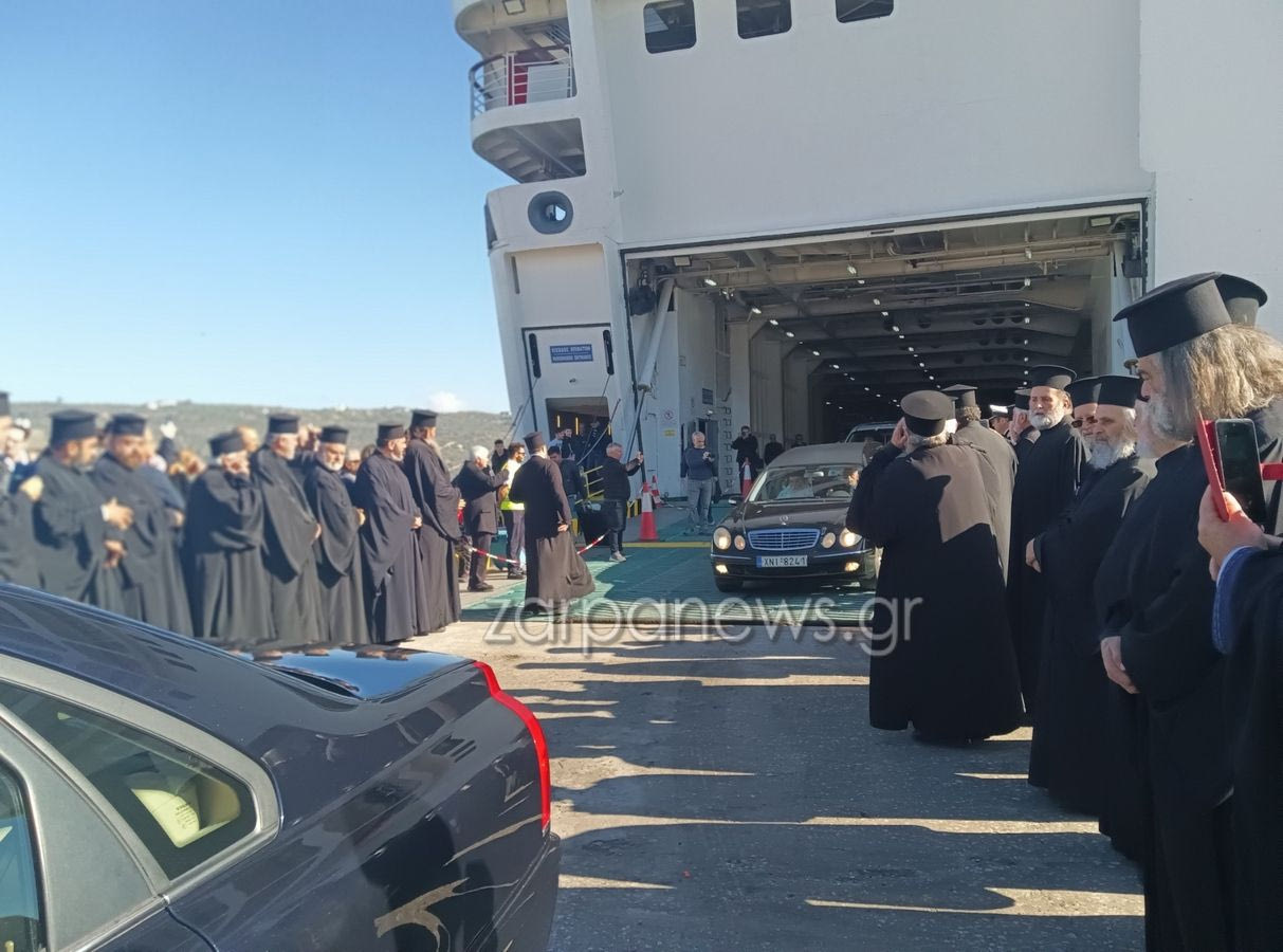 Το σκήνωμα συνοδεύουν οι άνθρωποι που ήταν κοντά του μέχρι την τελευταία στιγμή της ζωής του, ενώ όπως φαίνεται στις φωτογραφίες του zarpanews.gr, στο λιμάνι βρέθηκαν από νωρίς πολλοί ιερείς για να υποδεχθούν το σκήνωμα του αγαπητού ιεράρχη.