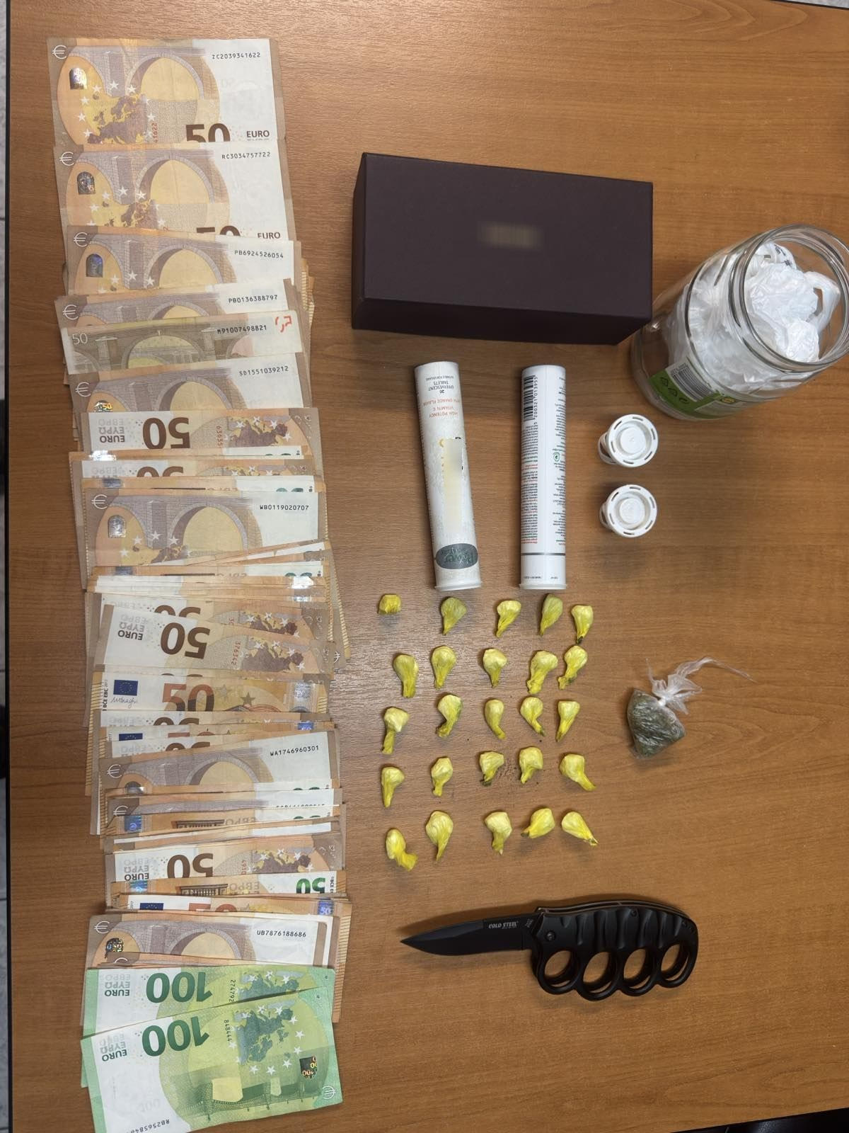 Αφού ακινητοποιήθηκε, συνελήφθη και σε έρευνα που ακολούθησε βρέθηκαν εντός του δοχείου και κατασχέθηκαν είκοσι πέντε (25) συσκευασίες, οι οποίες περιείχαν συνολικά 18,4 γραμμάρια κοκαΐνης. Στη συνέχεια πραγματοποιήθηκε έρευνα στην οικία του, κατά τη διάρκεια της οποίας βρέθηκαν και κατασχέθηκαν μικροποσότητα κάνναβης, μία σιδηρογροθιά με μαχαίρι και το χρηματικό ποσό των 6.100 ευρώ.