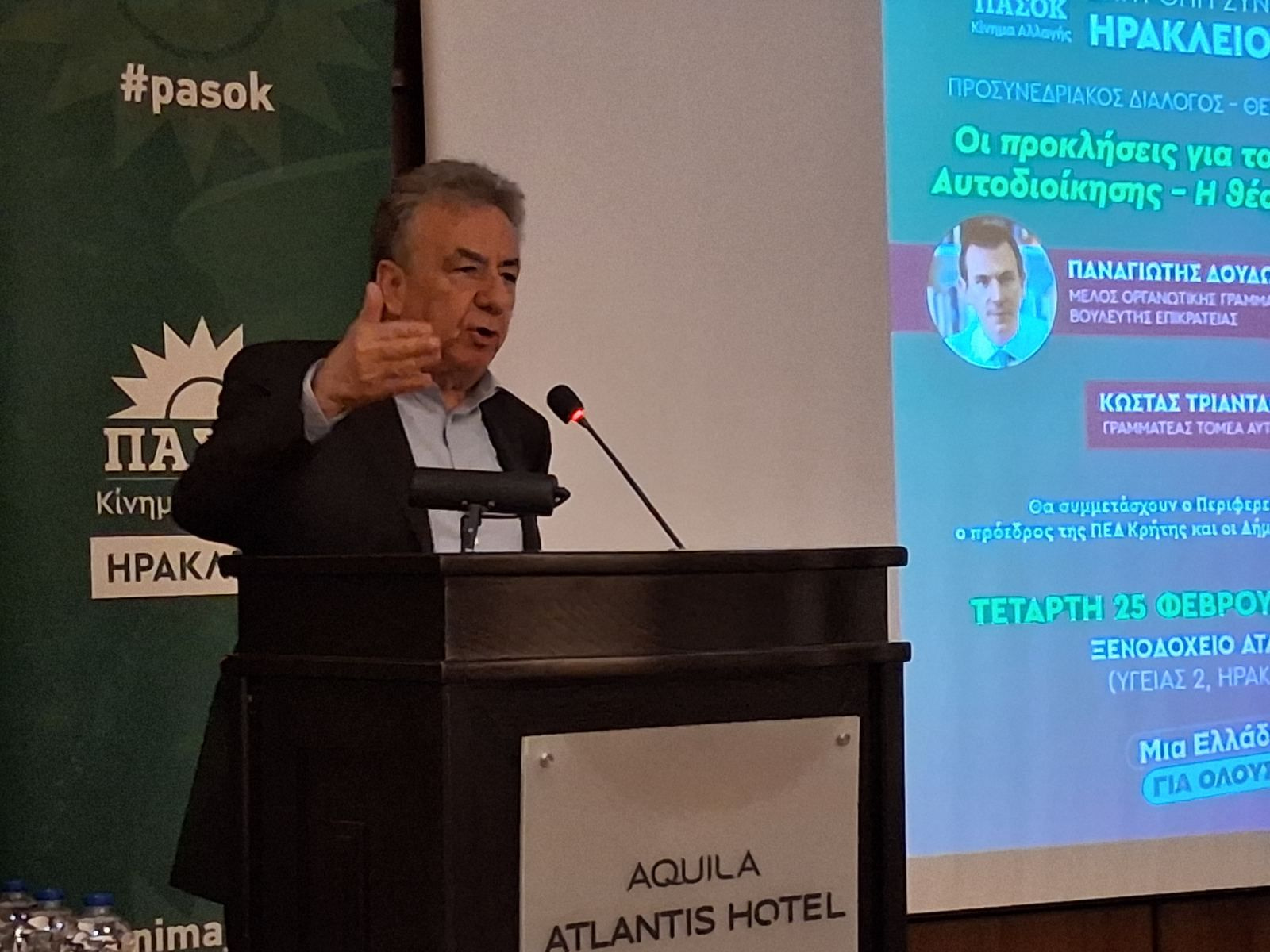 Ο Κωνσταντίνος Τριαντάφυλλος γραμματέας του Τομέα Αυτοδιοίκησης του ΠΑΣΟΚ λίγο πριν την εκδήλωση υπογράμμισε μεταξύ άλλων: «Είμαστε εδώ για να συζητήσουμε με τους αυτοδιοικητικούς, τα μέλη και τους φίλους του ΠΑΣΟΚ στο Ηράκλειο για τα μεγάλα ζητήματα, τις μεγάλες προκλήσεις που υπάρχουν για την τοπική αυτοδιοίκηση. Το ΠΑΣΟΚ ως η μόνη εναλλακτική δύναμη πολιτικής αλλαγής απέναντι στη Νέα Δημοκρατία και σε όλες τις συνέπειες αυτής της πολιτικής είναι εδώ για να συνδιαμορφώσει μαζί με την τοπική αυτοδιοίκηση την πρόταση εκείνη που θα δώσει λύσεις όχι μόνο στα προβλήματα των αιρετών και των δήμων αλλά κυρίως σε αυτά που έχουν ανάγκη οι τοπικές κοινωνίες».