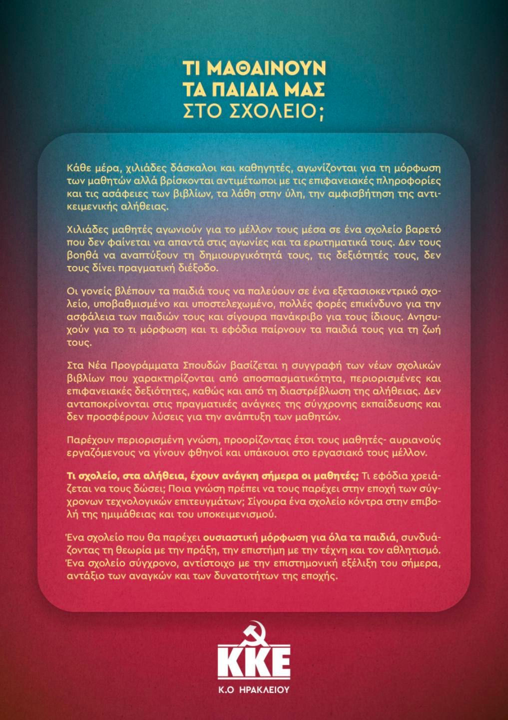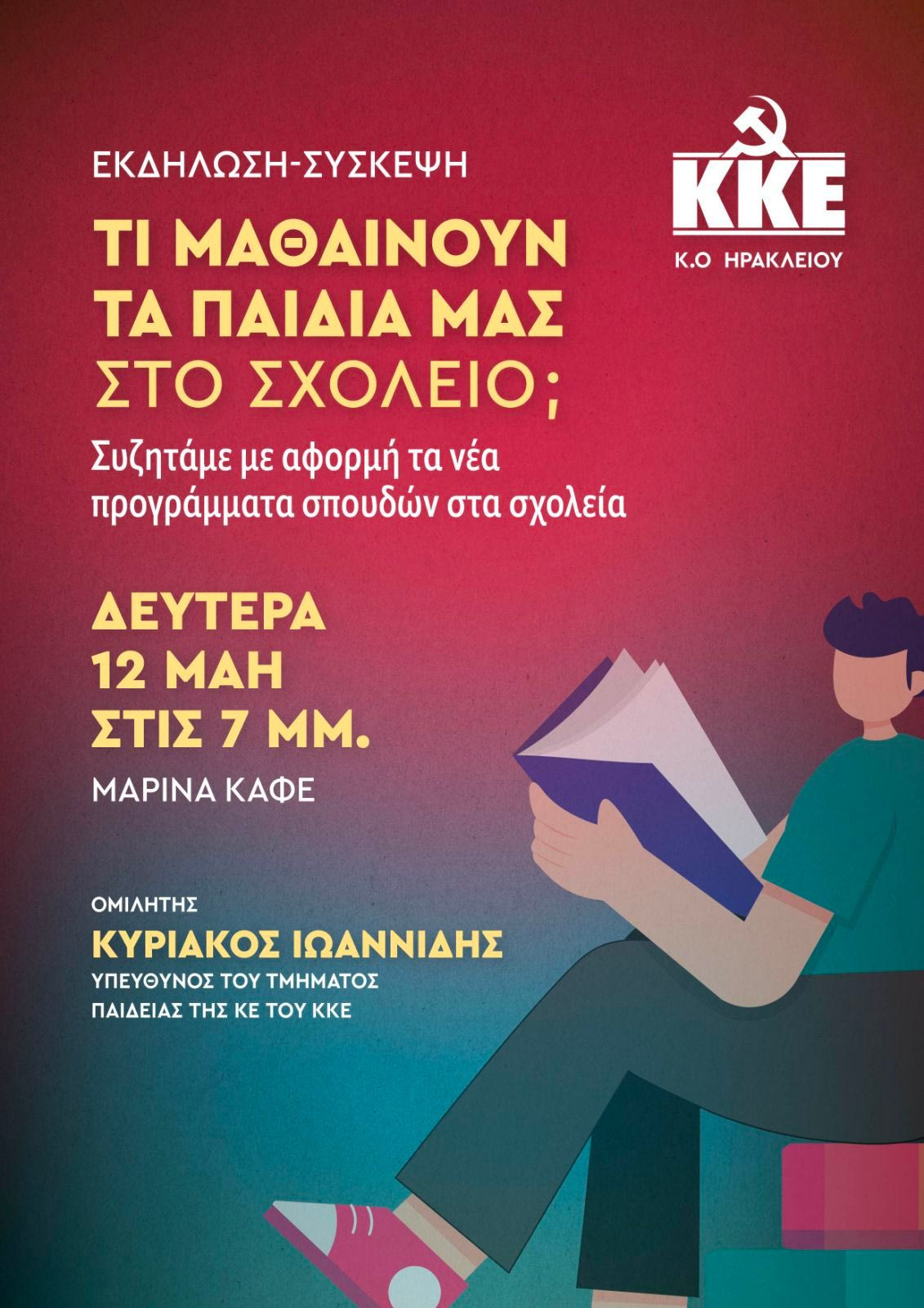 Η Τομεακή Επιτροπή Ηρακλείου του ΚΚΕ θα πραγματοποιήσει, τη Δευτέρα 12 Μαΐου στις 19:00, στο Καφέ Μαρίνα, Εκδήλωση – Σύσκεψη με θέμα : «Τι μαθαίνουν τα παιδιά μας στο σχολείο; Συζητάμε με αφορμή τα νέα προγράμματα σπουδών στα σχολεία».