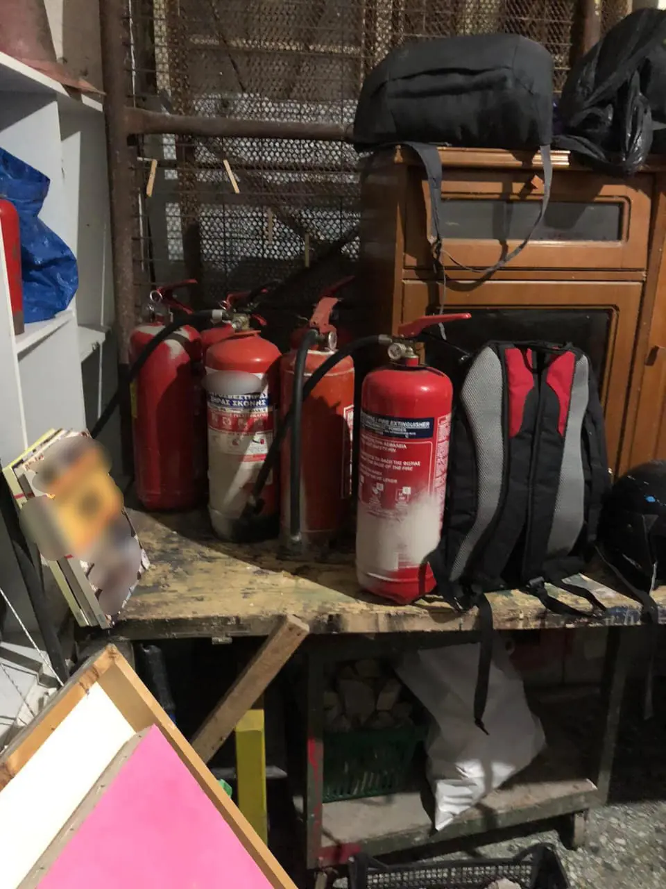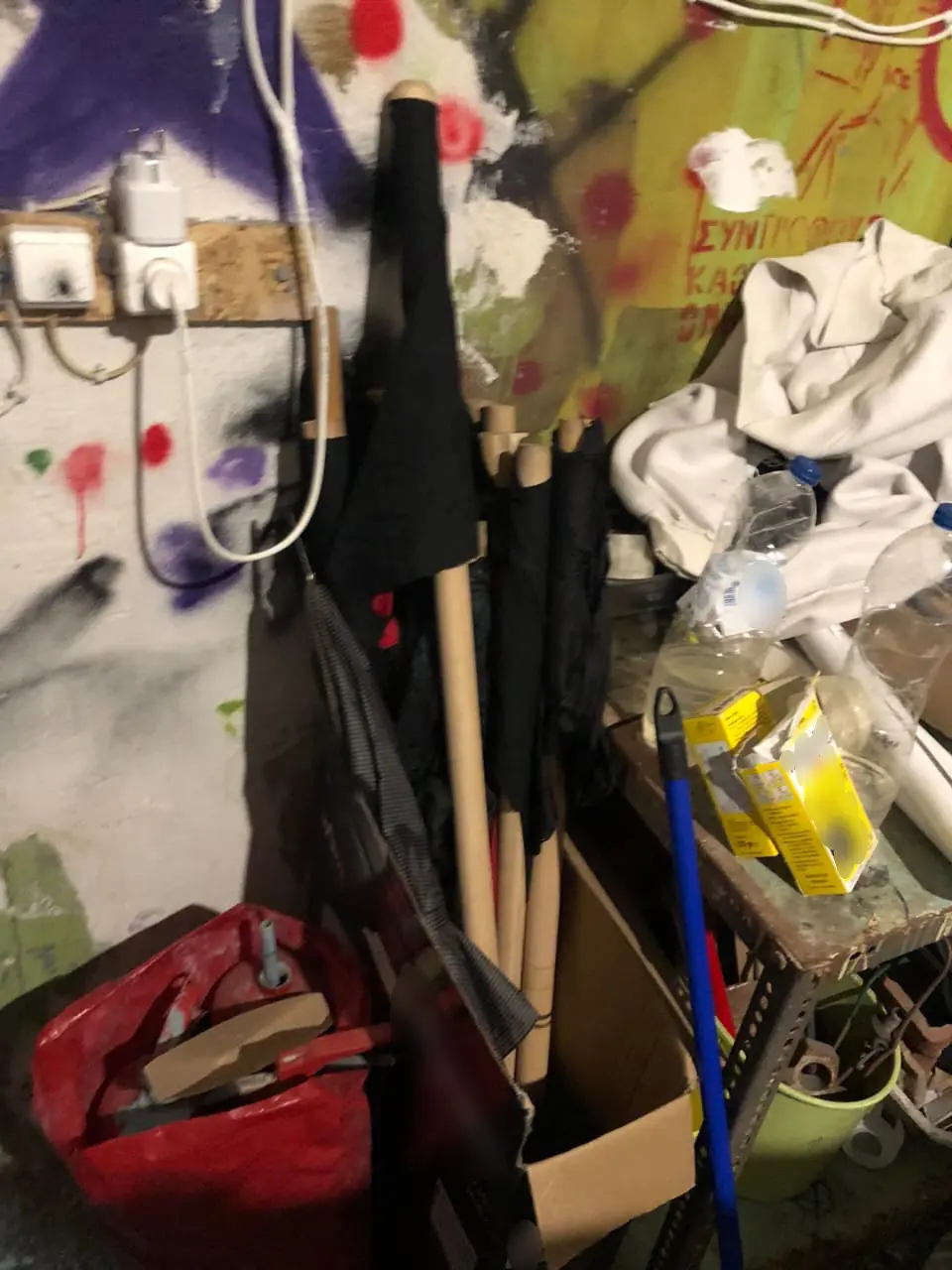Σε έρευνα που πραγματοποιήθηκε στο χώρο του κτιρίου βρέθηκαν και κατασχέθηκαν πλήθος ξύλινων κονταριών, μεγάλος αριθμός κρανών δικυκλιστή, πυροσβεστήρες, πληθώρα αντιασφυξιογόνων μασκών, δοχεία με εύφλεκτο υγρό και αυτοσχέδιες ασπίδες.