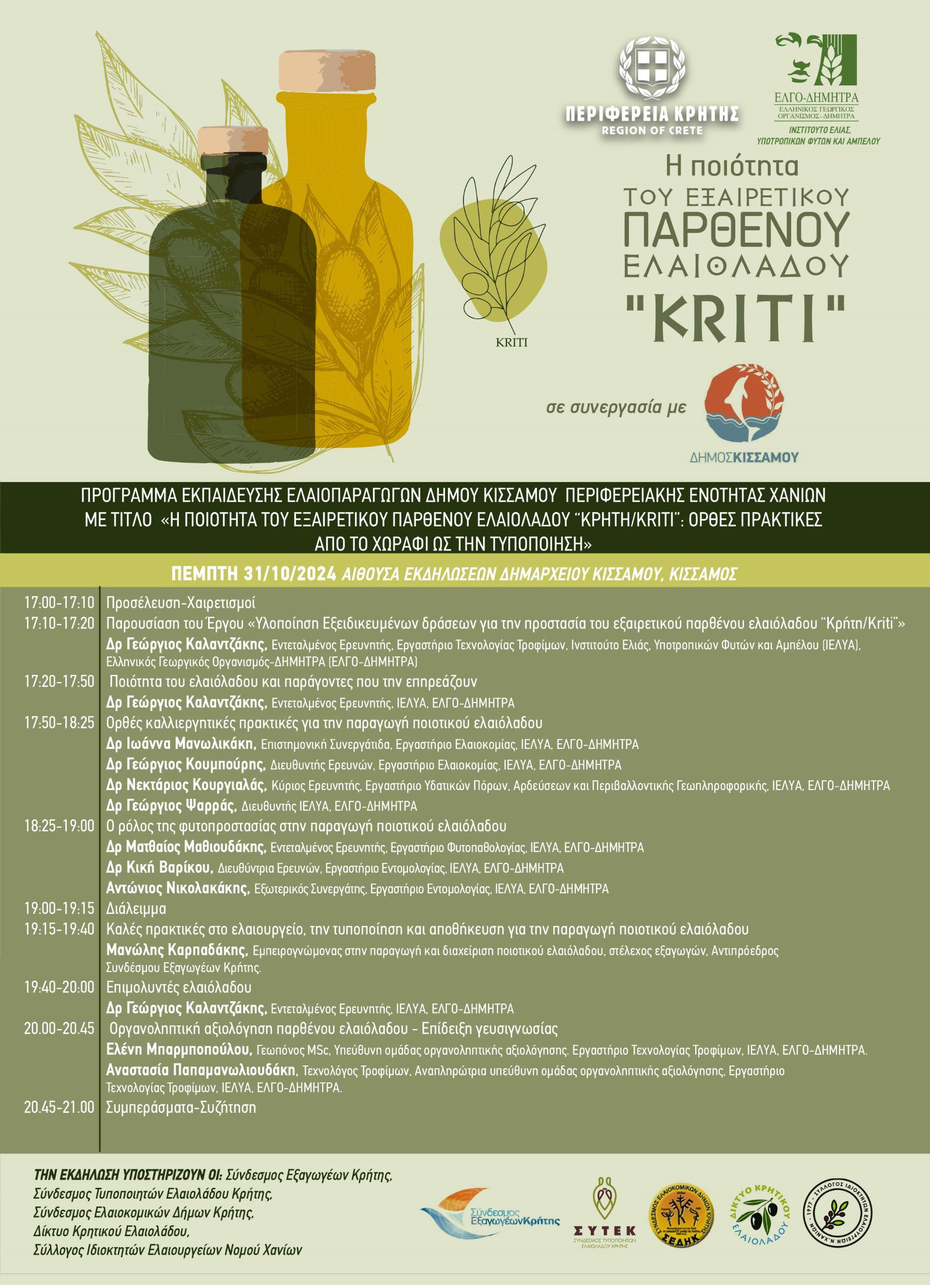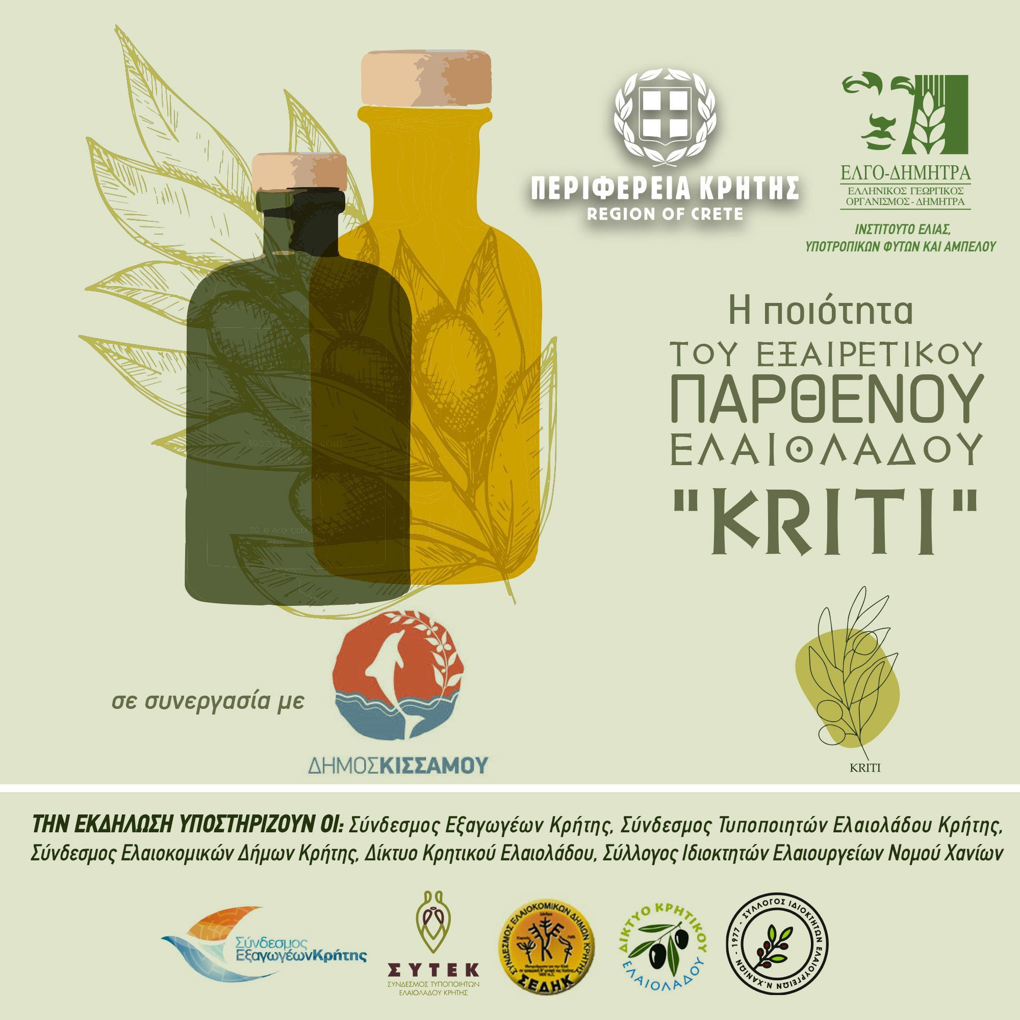Η Περιφέρεια Κρήτης και ο Ελληνικός Γεωργικός Οργανισμός-ΔΗΜΗΤΡΑ (ΕΛΓΟ-ΔΗΜΗΤΡΑ), σε συνεργασία με το Δήμο Κισσάμου, διοργανώνουν εσπερίδα για την ποιότητα του Εξαιρετικού Παρθένου Ελαιόλαδου “Κρήτη/Kriti”, η οποία θα πραγματοποιηθεί την Πέμπτη 31 Οκτωβρίου 2024 στις 17:00 μ.μ στην Αίθουσα Εκδηλώσεων του Δημαρχείου Κισσάμου στην Κίσσαμο.
