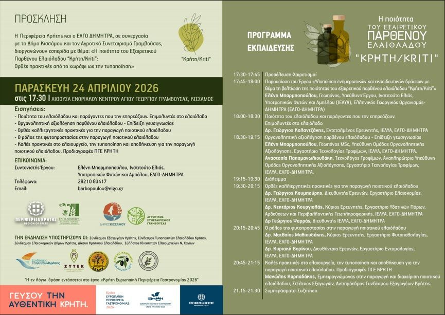 Η Περιφέρεια Κρήτης και ο Ελληνικός Γεωργικός Οργανισμός-ΔΗΜΗΤΡΑ (ΕΛΓΟ-ΔΗΜΗΤΡΑ), σε συνεργασία με το Δήμο Κισσάμου και τον Αγροτικό Συνεταιρισμό Γραμβούσας, διοργανώνουν εσπερίδα για την ποιότητα του Εξαιρετικού Παρθένου Ελαιόλαδου “Κρήτη/Kriti”, η οποία θα πραγματοποιηθεί την Παρασκευή 24 Απριλίου 2026 στις 17:30 μ.μ στην Αίθουσα Ενοριακού Κέντρου Αγίου Γεωργίου Γραμβούσας στην Κίσσαμο.