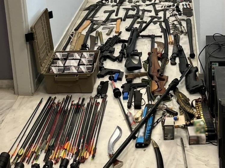 Από την έρευνα βρέθηκαν και κατασχέθηκαν μεταξύ άλλων 2 δυναμίτες, 7 αεροβόλα όπλα, 5 σπαθιά, 107 τσεκούρια, 117 μαχαίρια, 3 τόξα, 3 βαλλίστρες, 741 φυσίγγια και πλήθος άλλων ειδών οπλισμού.