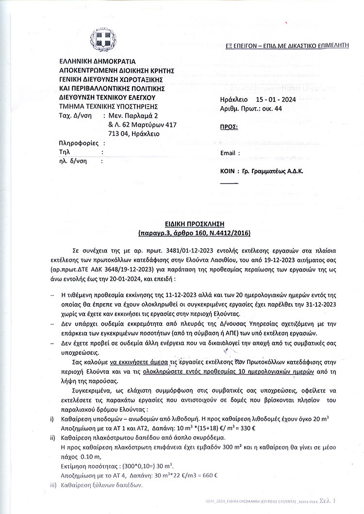 Ούτε χθες έπιασαν δουλειά οι μπουλντόζες του εργολάβου που έχει αναλάβει το έργο της εκτέλεσης τελεσίδικων πρωτόκολλων απομάκρυνσης αυθαίρετων που καταπατούν αιγιαλούς και παραλίες στην Ελούντα και την Ιεράπετρα, ενώ επιβεβαιώνεται πλήρως το χθεσινό ρεπορτάζ της «Π» σε σχέση με την Ειδική Πρόσκληση που έγινε στον ανάδοχο του έργου, από την Αποκεντρωμένη Διοίκηση Κρήτης. Με την Ειδική Πρόσκληση καλείται εντός 10ημέρου να εκτελέσει τις εργασίες που έχει αναλάβει σε αντίθετη περίπτωση κηρύσσεται έκπτωτος.