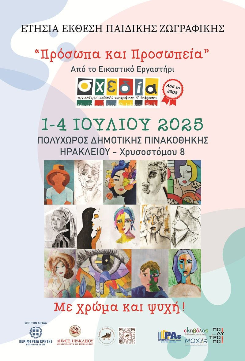 Στον Πολυχώρο της Δημοτικής Πινακοθήκης του Δήμου Ηρακλείου(Χρυσοστόμου 8) θα φιλοξενηθεί από 1 έως 4 Ιουλίου 2025, η καθιερωμένη ετήσια έκθεση ζωγραφικής των Παιδικών Εικαστικών Τμημάτων του Καλλιτεχνικού Εργαστηρίου ΣΧΕΔίΑ, με θέμα «Πρόσωπα και Προσωπεία», που διοργανώνεται για 17η χρονιά.