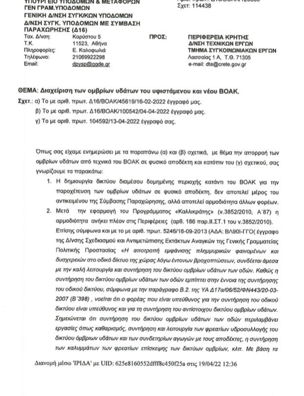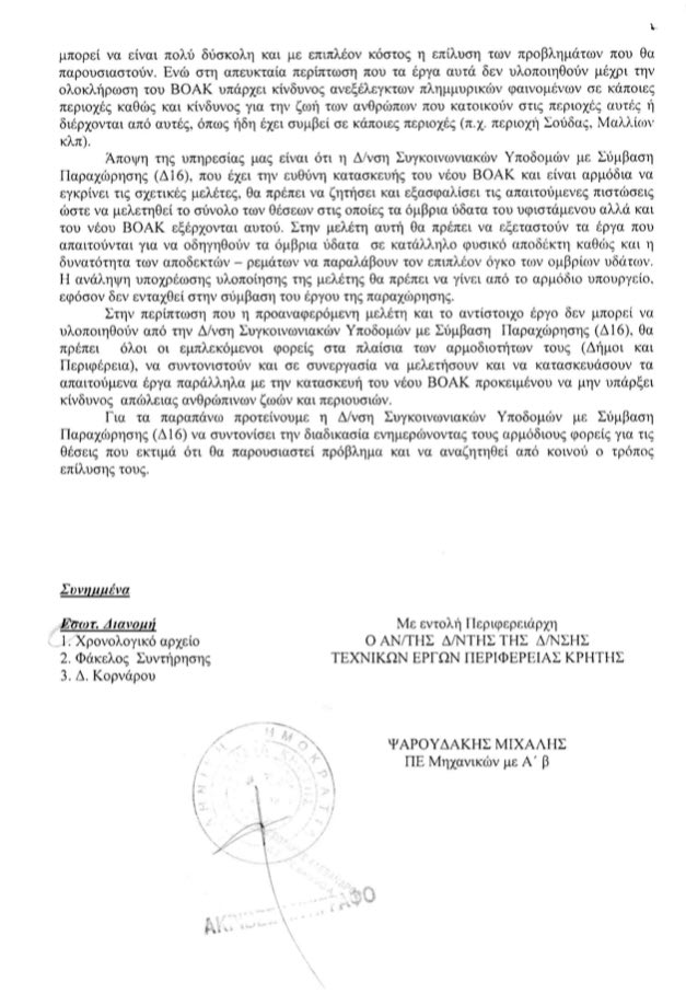 Απαντώντας η Γενική Διεύθυνση Συγκοινωνιακών Υποδομών σημειώνει ότι δεν προκύπτει αρμοδιότητα δική της να εγκρίνει τις απαραίτητες μελέτες ή να κατασκευάσει έργα που οδηγούν τα όμβρια κατάντι του υφιστάμενου και νέου ΒΟΑΚ σε φυσικό αποδέκτη.