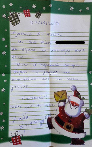 Αλλά και παιδιά με αθώα και καθαρή ψυχή στέλνουν γράμματα συμπαράστασης και ελπίδας για ένα καλύτερο αύριο. Σύμφωνα με τα λεγόμενα της κ. Σταυρακάκη: «Ζητάνε από τον Αϊ – Βασίλη ειρήνη και αγάπη για όλους. Πέρυσι αναφέρθηκαν και στα προσφυγόπουλα. Ανάλογα με αυτό που βιώνουν, αυτό που ζούμε ως ελληνική κοινωνία το αποτυπώνουν οι μικροί και στα γράμματά τους. Άλλοτε είναι η οικονομική κρίση ή το προσφυγικό. Τα παιδιά είναι πολύ ευαίσθητα και το δείχνουν».