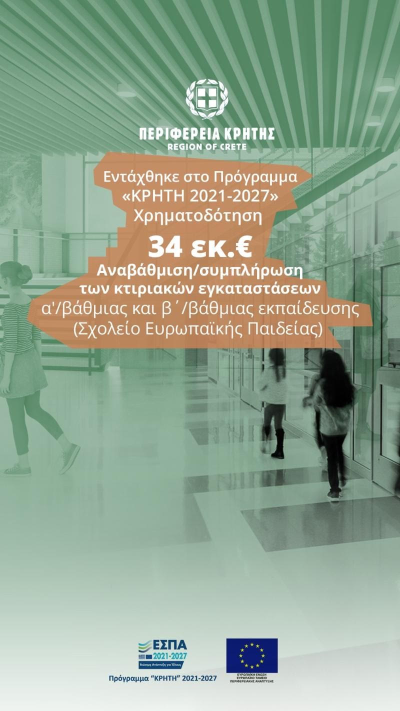 Σε μια σημαντική πρωτοβουλία για την αναβάθμιση των εκπαιδευτικών υποδομών της Κρήτης προχωρά η Περιφέρεια, με την έκδοση πρόσκλησης για την ανέγερση του νέου Σχολείου Ευρωπαϊκής Παιδείας στο Ηράκλειο και συγκεκριμένα στις Βούτες. Η δημόσια δαπάνη που διατίθεται για το έργο ανέρχεται σε 34.000.000,00€ και καλύπτεται από το Πρόγραμμα «Κρήτη» 2021-2027 με τη συγχρηματοδότηση του Ευρωπαϊκού Ταμείου Περιφερειακής Ανάπτυξης (ΕΤΠΑ).