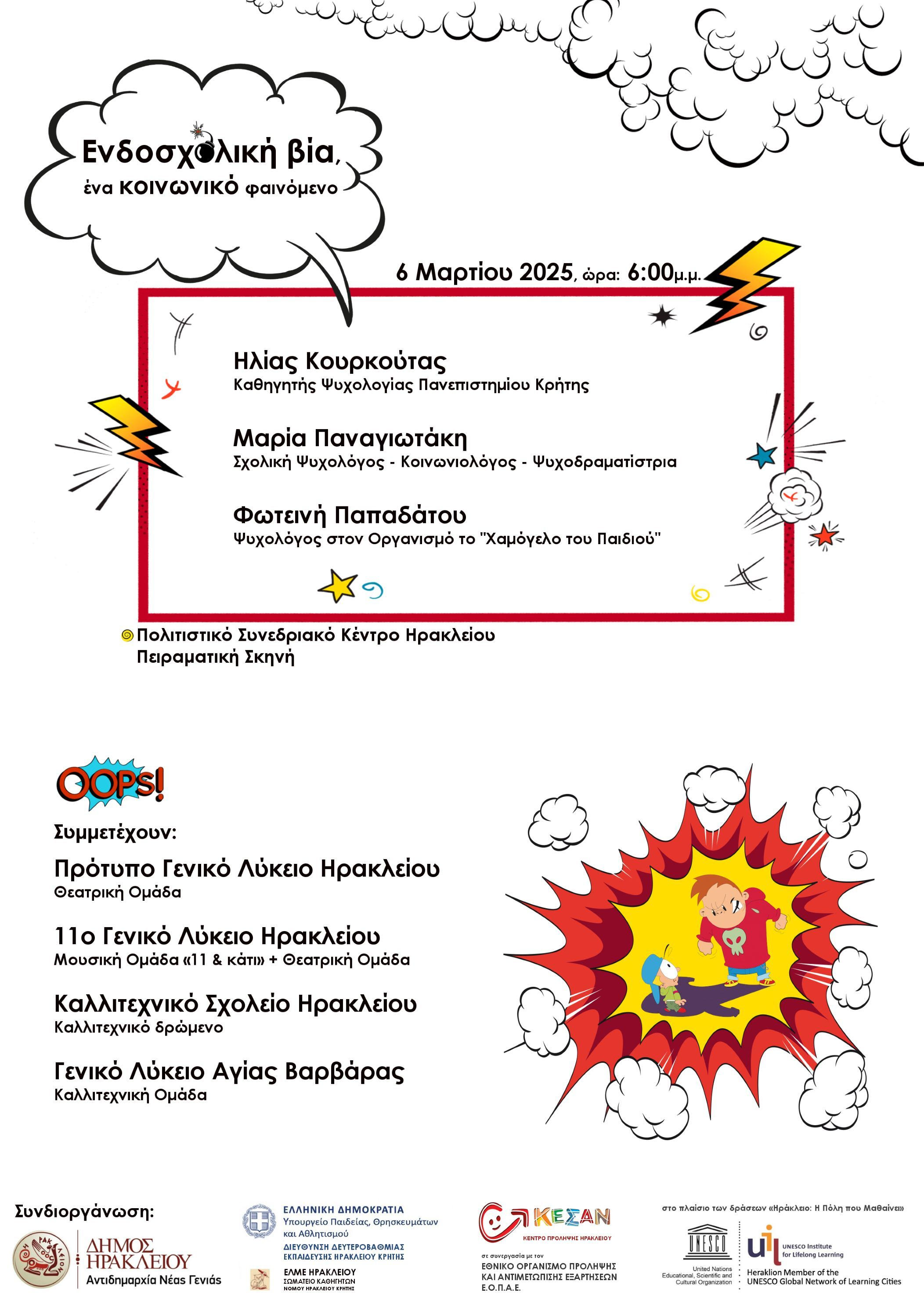 Εκδήλωση ευαισθητοποίησης με τίτλο «Ενδοσχολική βία, ένα κοινωνικό φαινόμενο» με αφορμή την Πανελλήνια Ημέρα κατά της σχολικής βίας και του εκφοβισμού («school bullying») θα πραγματοποιηθεί την Πέμπτη 6 Μαρτίου στις 6 το απόγευμα στην Πειραματική Σκηνή του Πολιτιστικού Συνεδριακού Κέντρου Ηρακλείου.