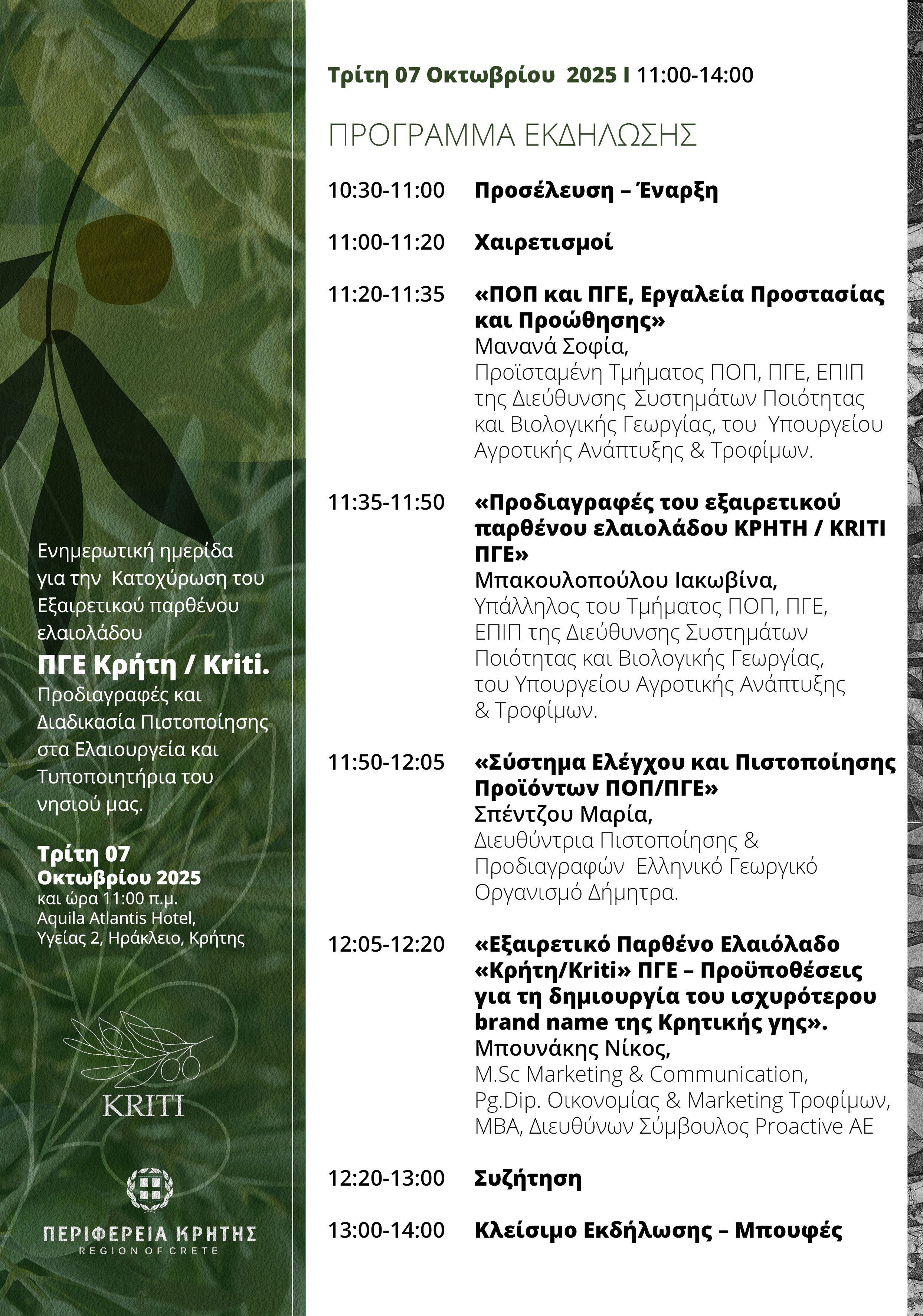 - 12:05 – 12:20 | «Εξαιρετικό Παρθένο Ελαιόλαδο «Κρήτη/Kriti» ΠΓΕ – Προϋποθέσεις για τη δημιουργία του ισχυρότερου brand name της Κρητικής γης»