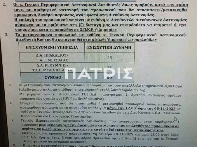 Σύμφωνα με πληροφορίες του patris.gr, 25 αστυνομικοί θα ενισχύσουν τα ΤΑΕ Μεσαράς και άλλα 25 άτομα θα ενισχύσουν τα ΤΑΕ Μυλοποτάμου.