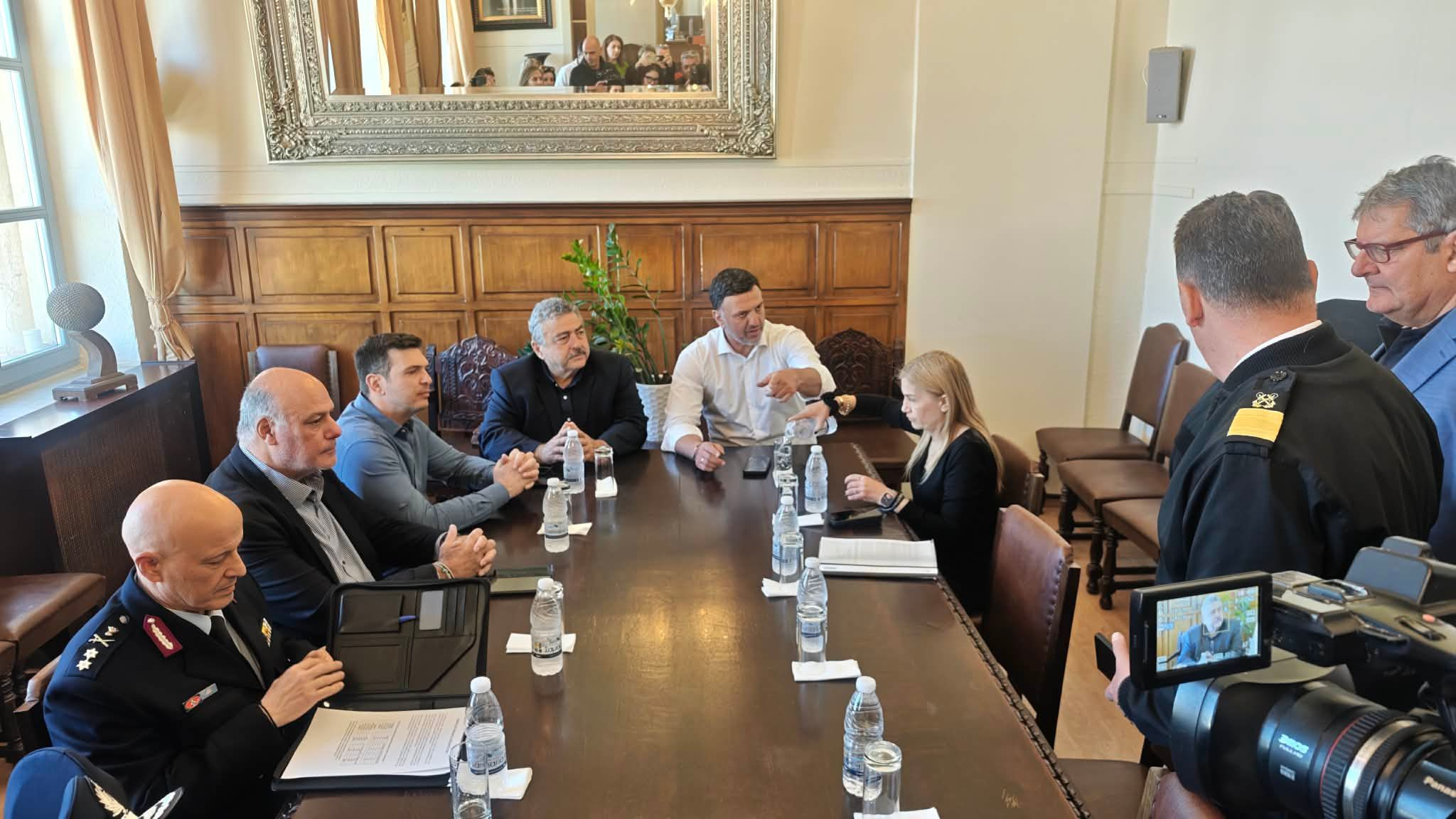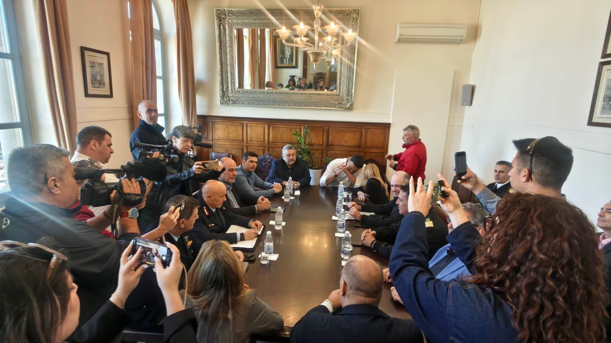Ακολούθησε ευρεία σύσκεψη στην αντιπεριφέρεια Χανίων, παρούσης της Υφυπουργού Μεταναστευτικής Πολιτικής και Ασύλου, Σέβης Βολουδάκη, του βουλευτή Αλεξάνδρου Μαρκογιαννάκη, του διευθυντή του γραφείου της Ντόρας Μπακογιάννη, Παναγιώτη Αντωνόπουλου, του Αντιπεριφερειάρχη, Νίκου Καλογερή, των Δημάρχων Χανίων, Πλατανιά, Σφακίων και Γαύδου, του προέδρου του Λιμενικού Ταμείου, Δημήτρη Βιριράκη, υπηρεσιακών στελεχών και αξιωματικών του Λ.Σ. και της ΕΛ.ΑΣ., ανάμεσα τους και ο νέος περιφερειακός διοικητής, Γιάννης Ορφανός.