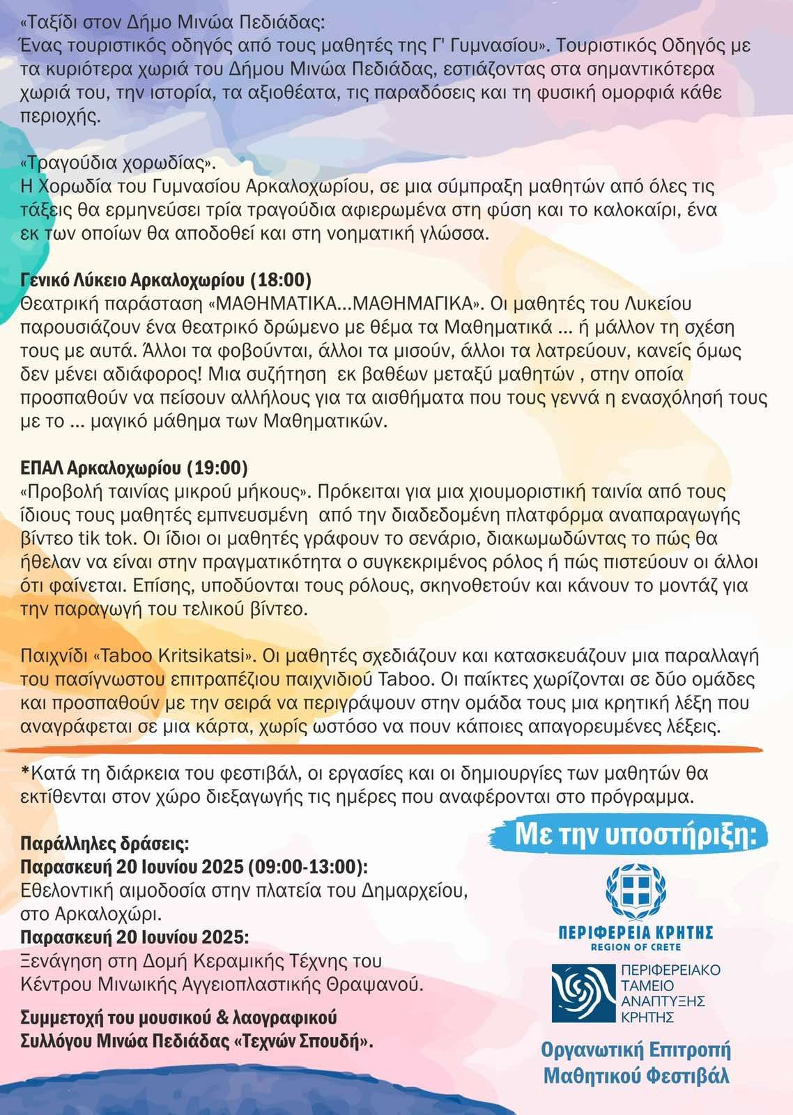 Για το τρέχον σχολικό έτος 2024-2025, το Μαθητικό Φεστιβάλ θα πραγματοποιηθεί το χρονικό διάστημα 10-13 Ιουνίου 2025 & 19-20 Ιουνίου 2025. Η θεματική του θα είναι η «Τέχνη» και θα πραγματοποιηθεί στο Αρκαλοχώρι, με επίκεντρο το Συνεδριακό Κέντρο Αρκαλοχωρίου.