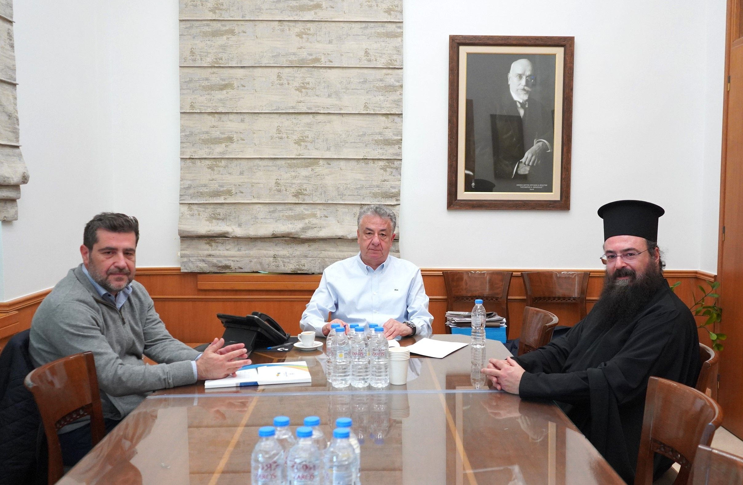 Ο Σεβασμιότατος κ. Γεράσιμος ευχαριστώντας τον Περιφερειάρχη Σταύρο Αρναουτάκη για την διασφάλιση της χρηματοδότησης για την αποκατάσταση-επισκευή του Ιερού Μητροπολιτικού Ναού, του πρόσφερε αναμνηστικό αντίγραφο των εγκαινίων της Μ. Παναγίας Νεαπόλεως.